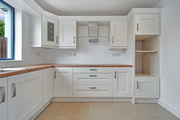 Living Room 4.5 x 3.8 Laminated timber flooring. Bay window promoting views over Letterkenny Town. Fireplace with solid fuel wood burning stove and back boiler to compliment the oil fired heating. Data points for media wall. Double door leading to kitchen/dining area.