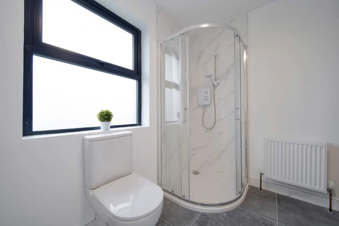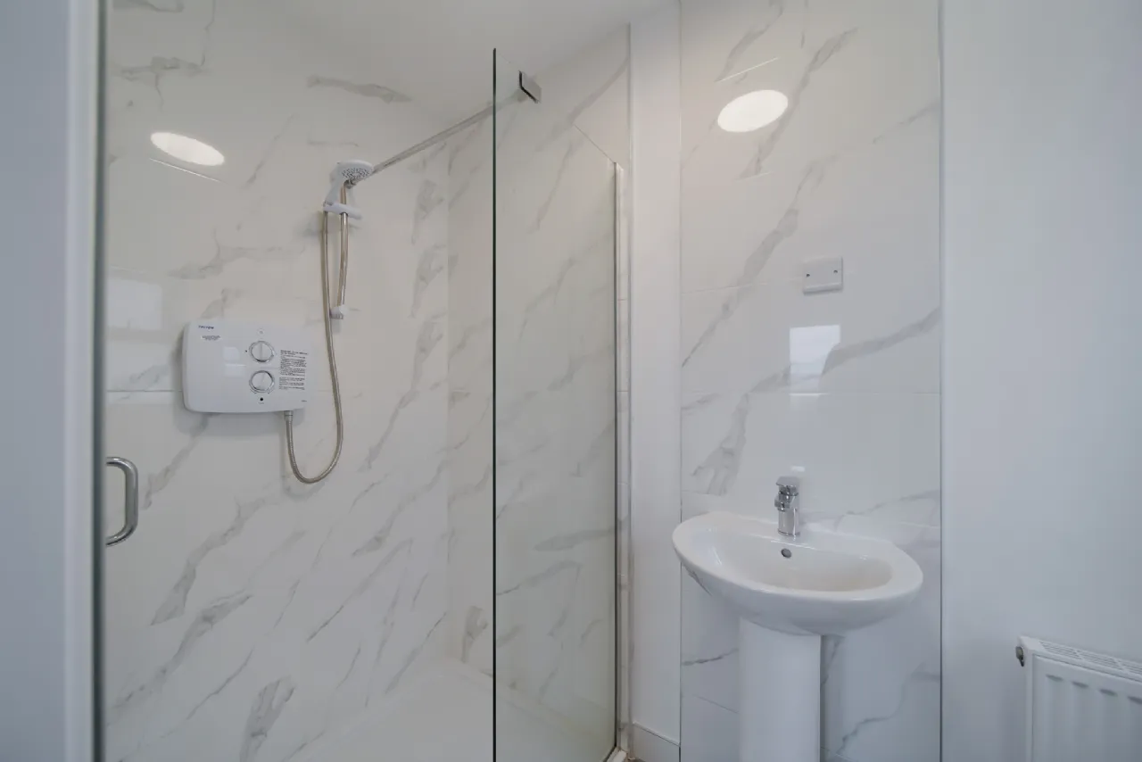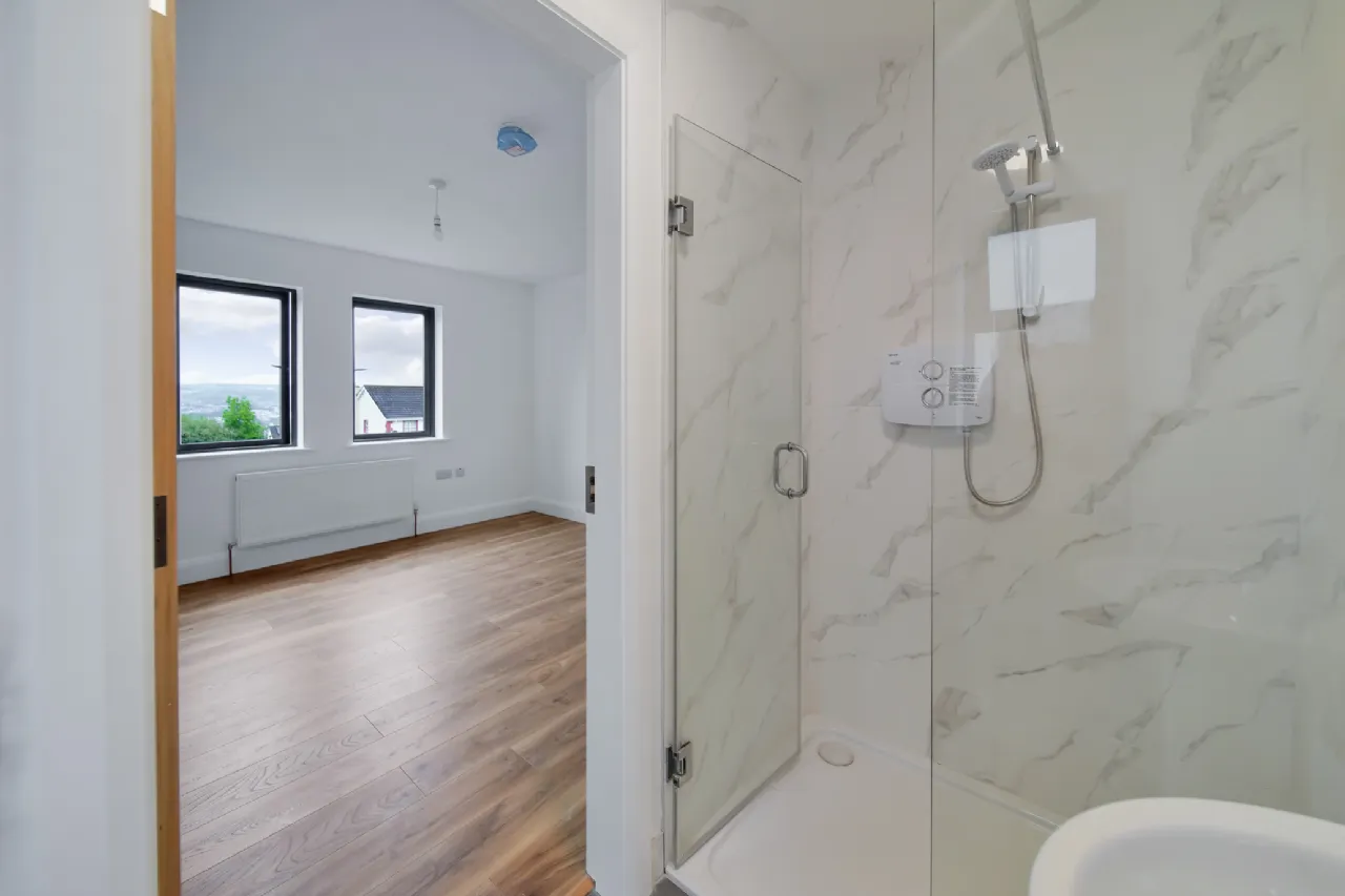Ensuite 2.5 x 1.2 Tiled flooring and partially tiled walls. Comprising w.c wash hand basin and shower.