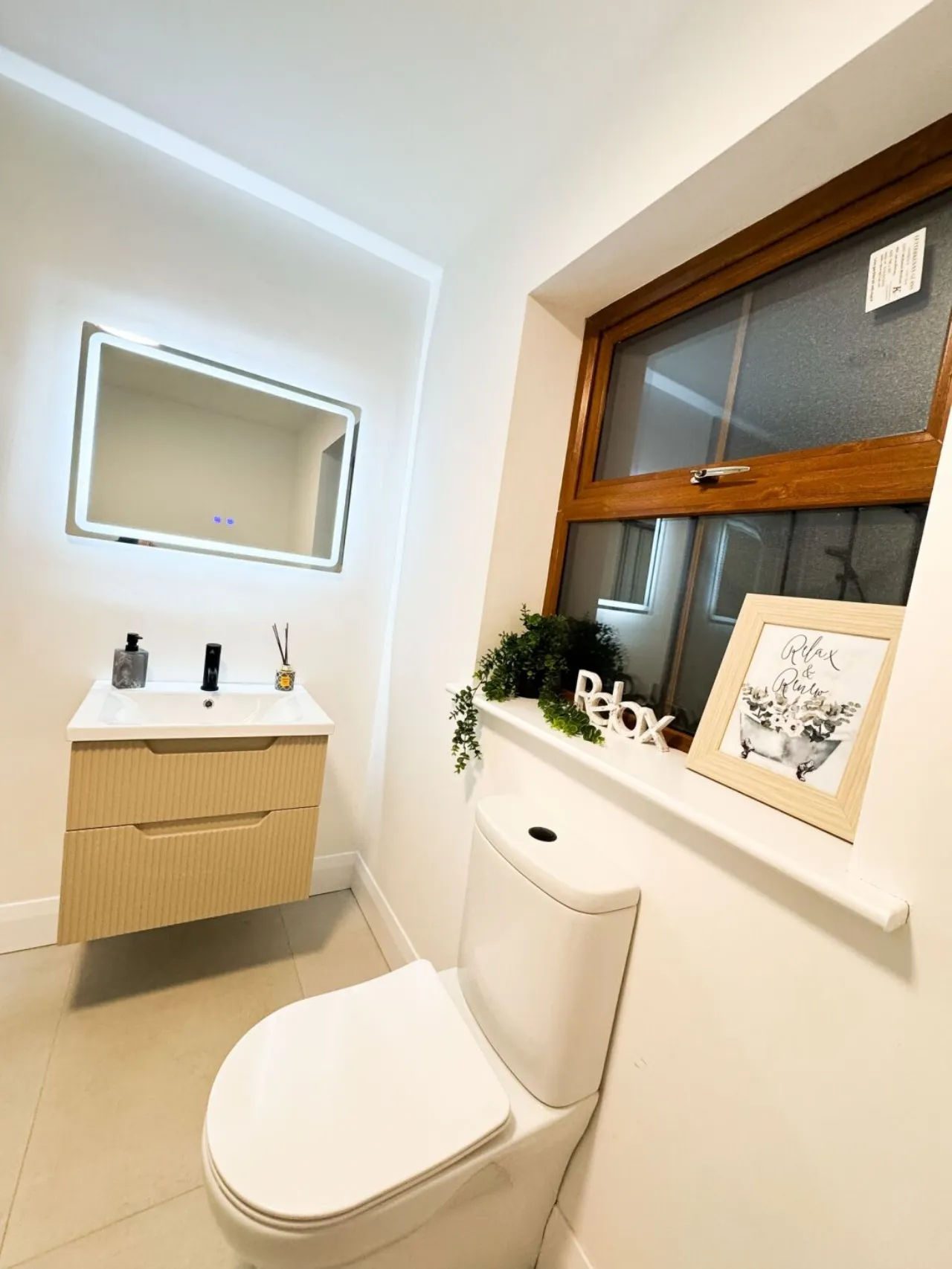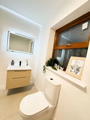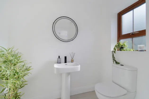 Downstairs WC Broad tile flooring. WC and wash hand basin