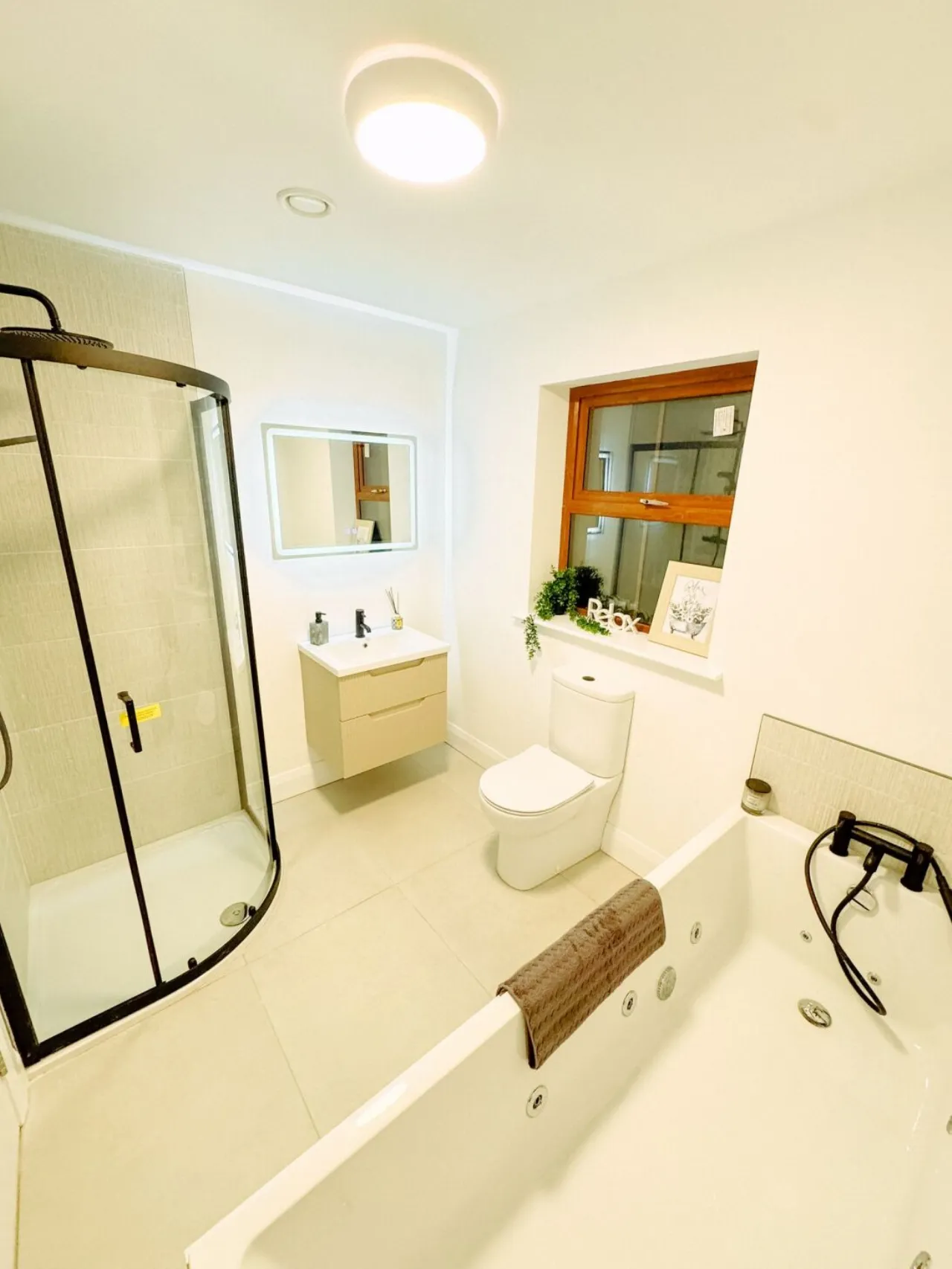 Bathroom Jacuzzi whirlpool bath with 18 jets. WC, wash hand basin, corner shower.