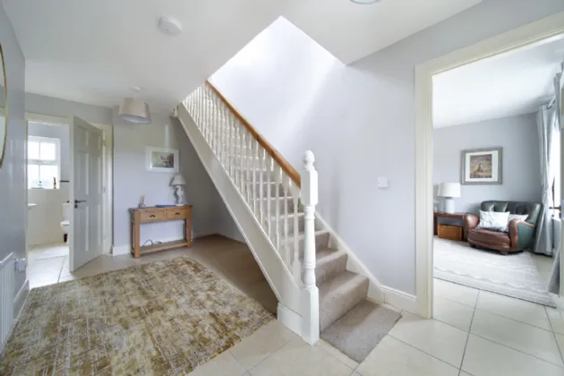Hallway 5.0 x 2.46 Tiled flooring. Carpet covered staircase leading to first floor.
