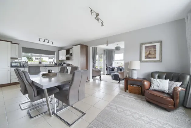 Kitchen/Dining area 7.3 x 3.6 Tiled flooring. Eye and low level painted timber units with single drainer sink and tiled splash back. Built in oven with four ring hob and overhead extractor fan. Integrated dishwasher and fridge freezer. Ample dining space. Open plan with sun room.