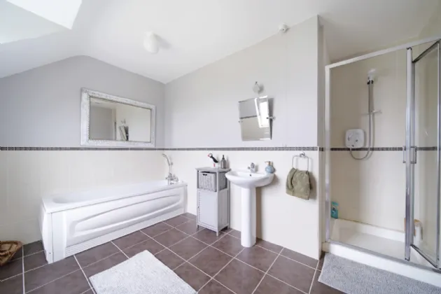 Bathroom 3.6 x 2.4 Tiled flooring and partially tiled walls. Comprising w.c, wash hand basin, bath and electric shower.