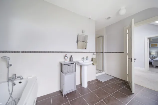 Ensuite Tiled flooring adn partially tiled walls. Comprising w.c, wash hand basin and electric shower.