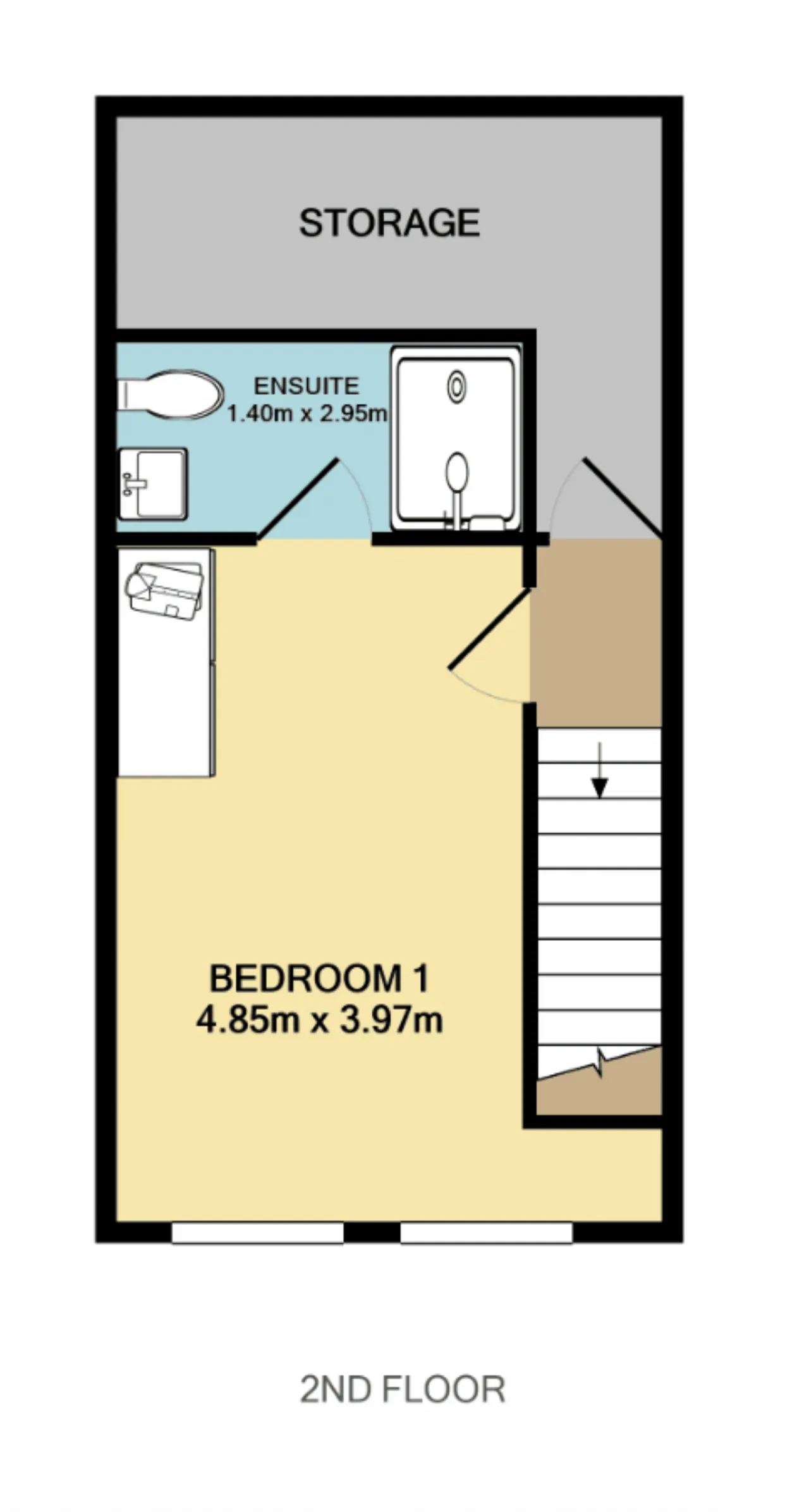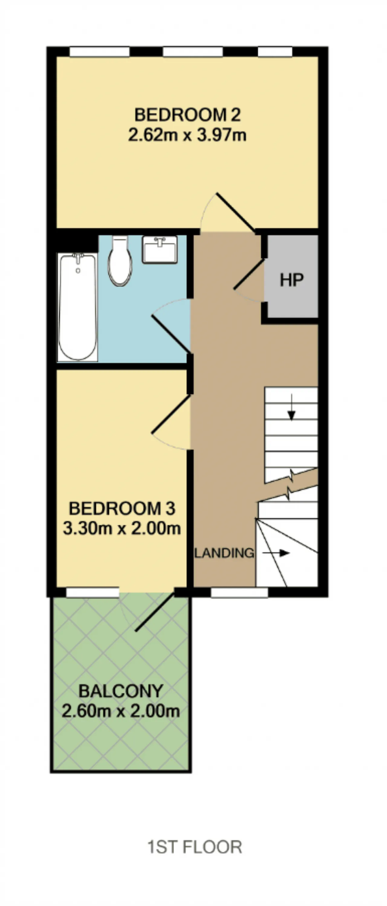 Bedroom 2 3.97m x 2.62m Large bright double bedroom spanning the width of the property and overlooking the communal rear courtyard and gardens. Laminate timber flooring.