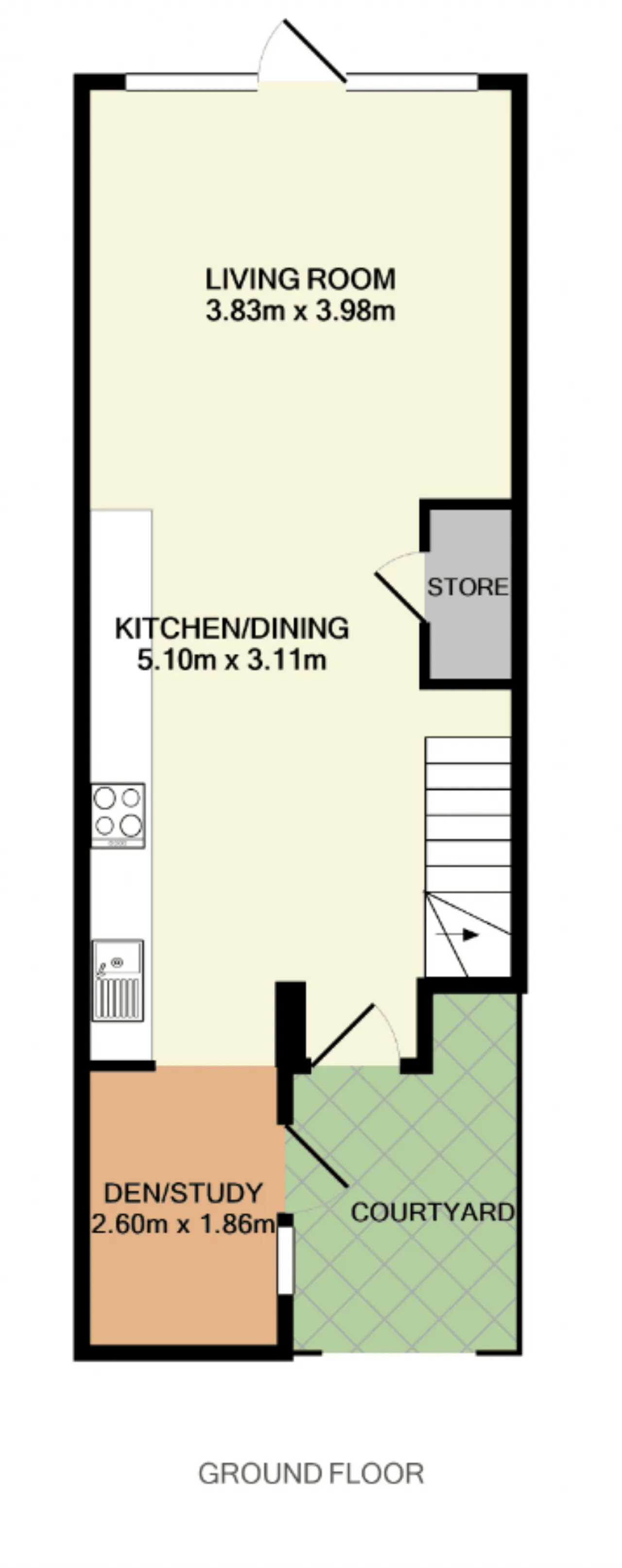 Study/Den 2.6m x 1.86m Located off the kitchen, could be used for a variety of uses. Laminate timber flooring. Door to front courtyard