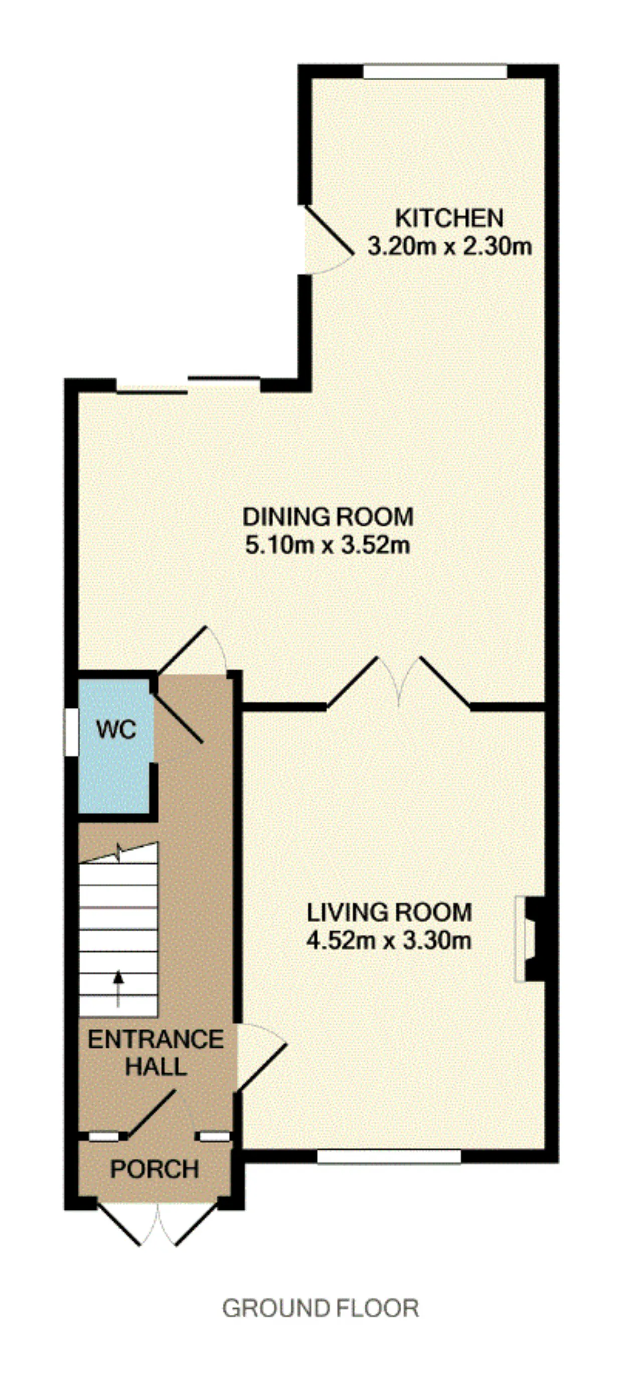 The property encompasses approx. 90sq m of light filled accommodation which comprises of a welcoming entrance hall with guest WC, living room with open fireplace, and the kitchen/dining room completes the downstairs living space. Upstairs there are two large double bedrooms both with fitted wardrobes and a master ensuite. There is a spacious single bedroom to the front and the family bathroom completes the accommodation.