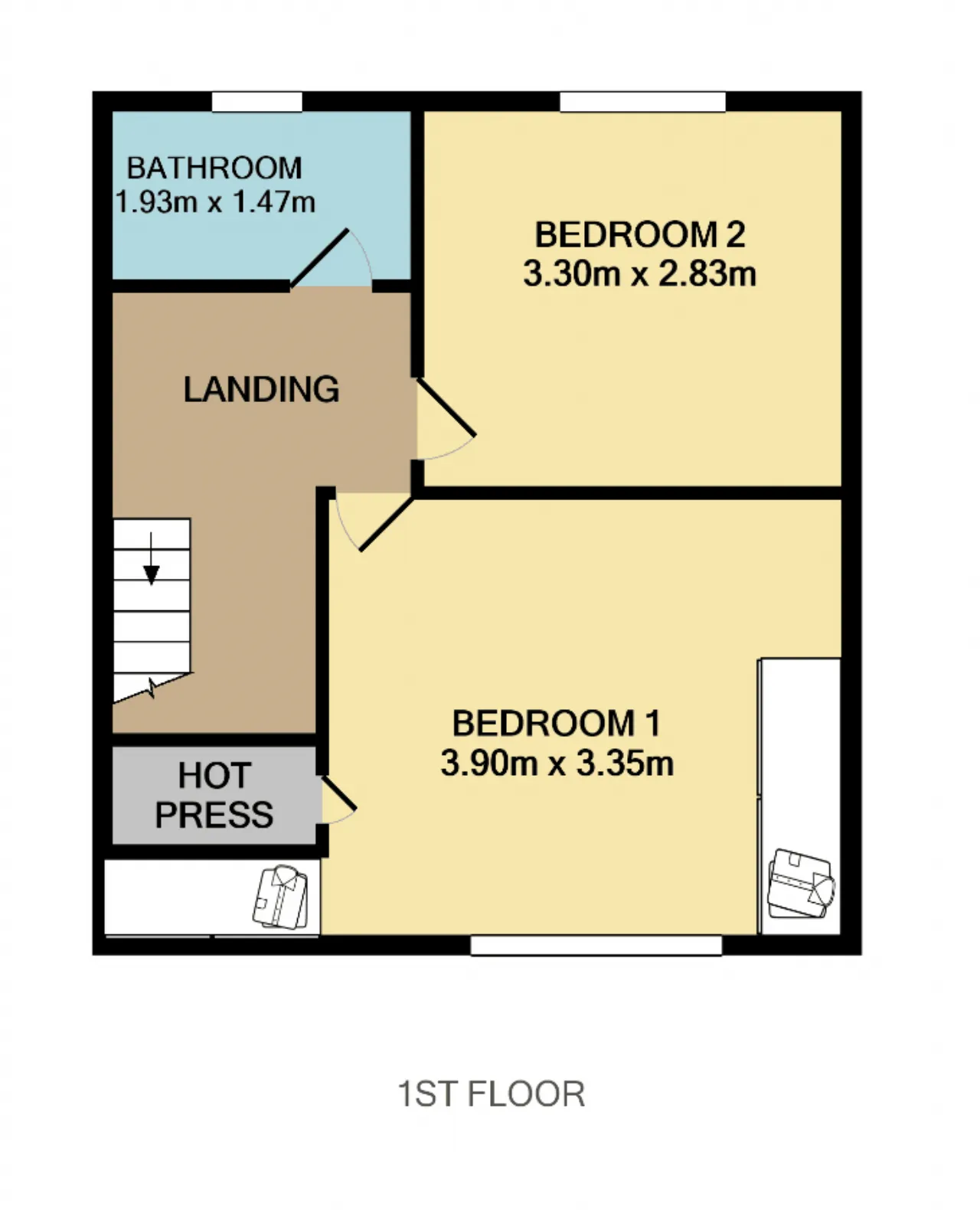Extending to 61sq m/ 652 sq ft, the accommodation comprises of an open-plan living room, kitchen and dining area with sliding door opening onto the rear garden. On the upper level there are two double bedrooms and a bathroom. The front of the property is approached by a driveway which provides off-street parking. The rear garden which is low maintenance and laid out with a large deck ideal for al fresco dining and lawn. The block shed is also plumbed for a washing machine and dryer.