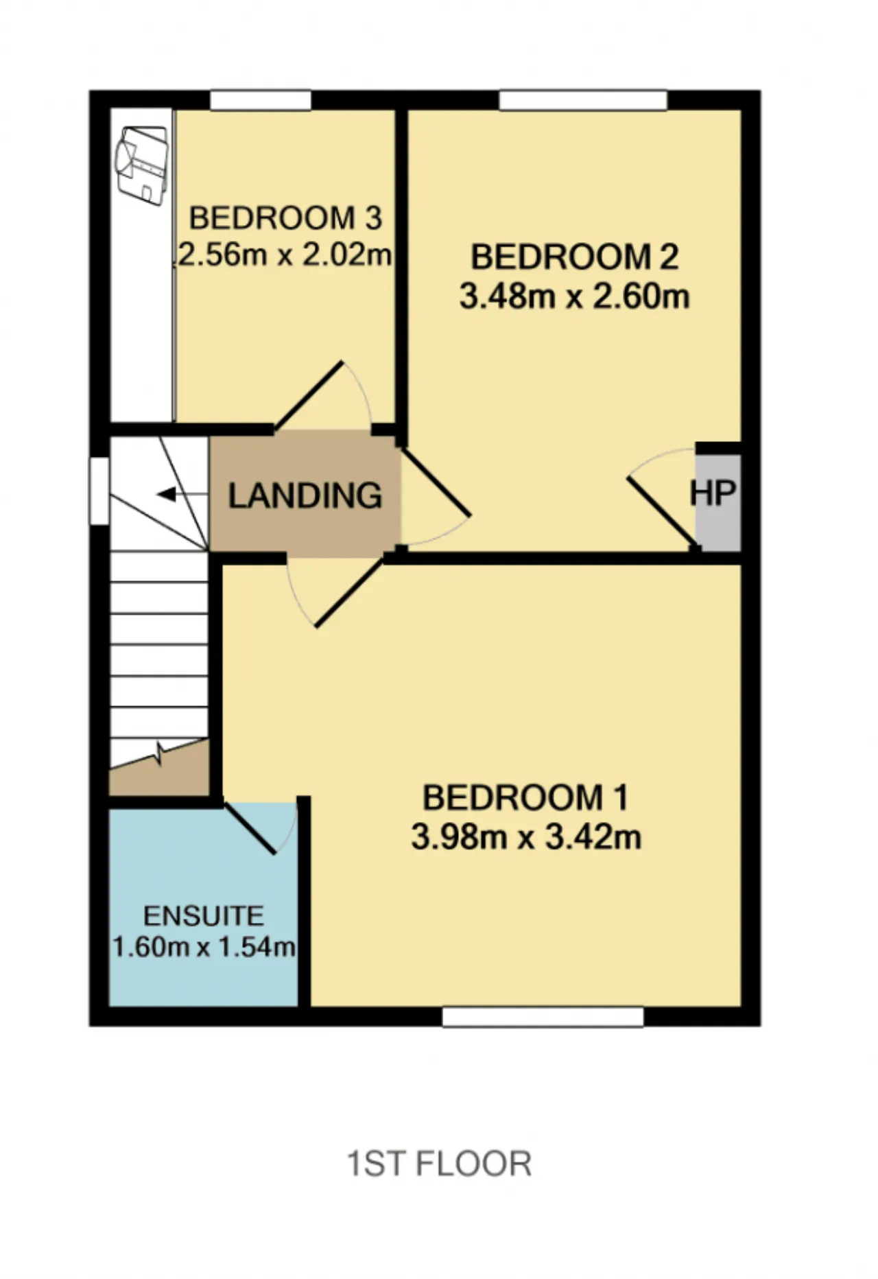 Bedroom 1 3.98m x 3.42m Master bedroom to the front of the property with carpet flooring and ensuite.
