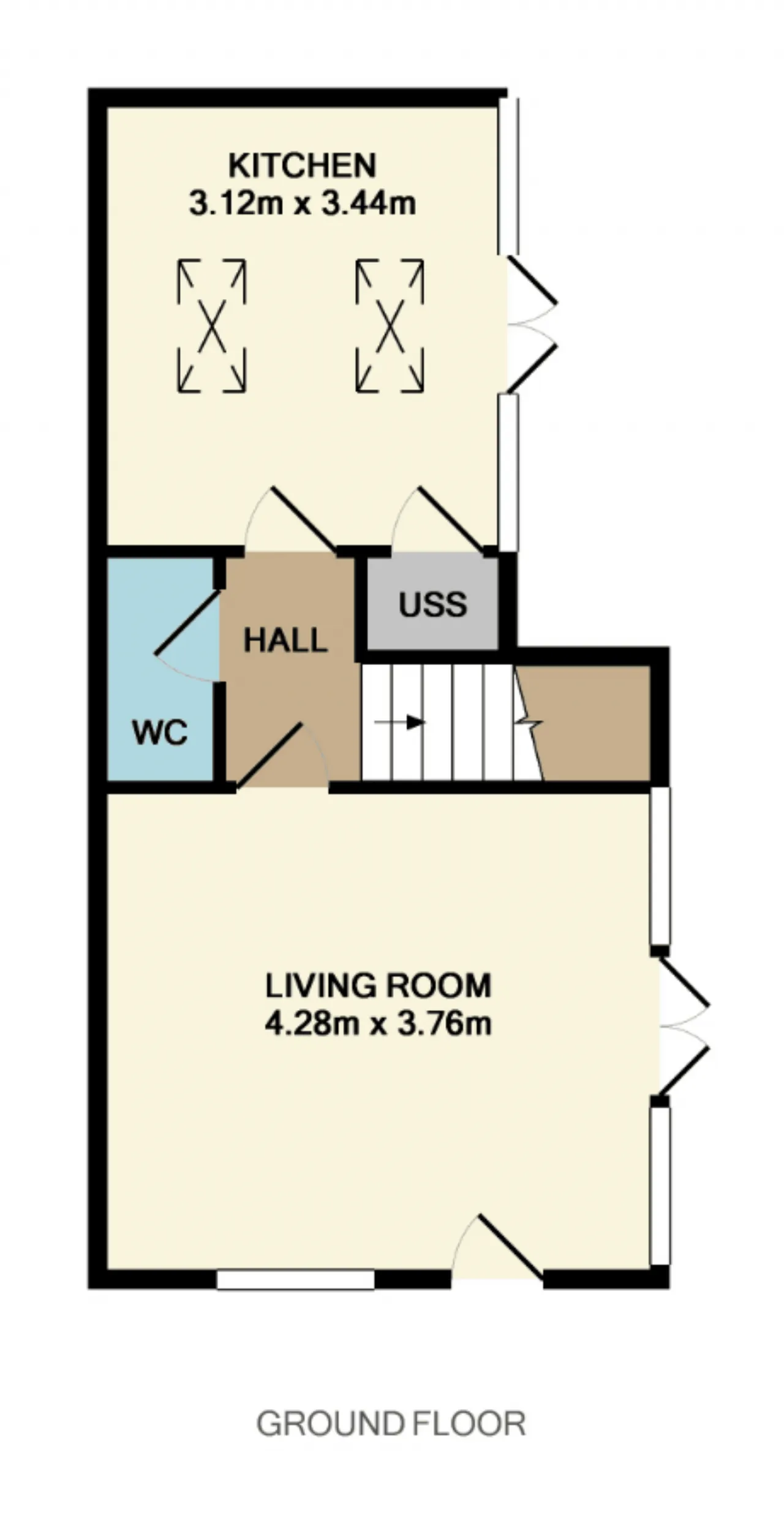 Kitchen 3.22m x 4.35m Floor and eye level units, tiled splashback, understairs storage, Velux windows and patio doors to rear garden