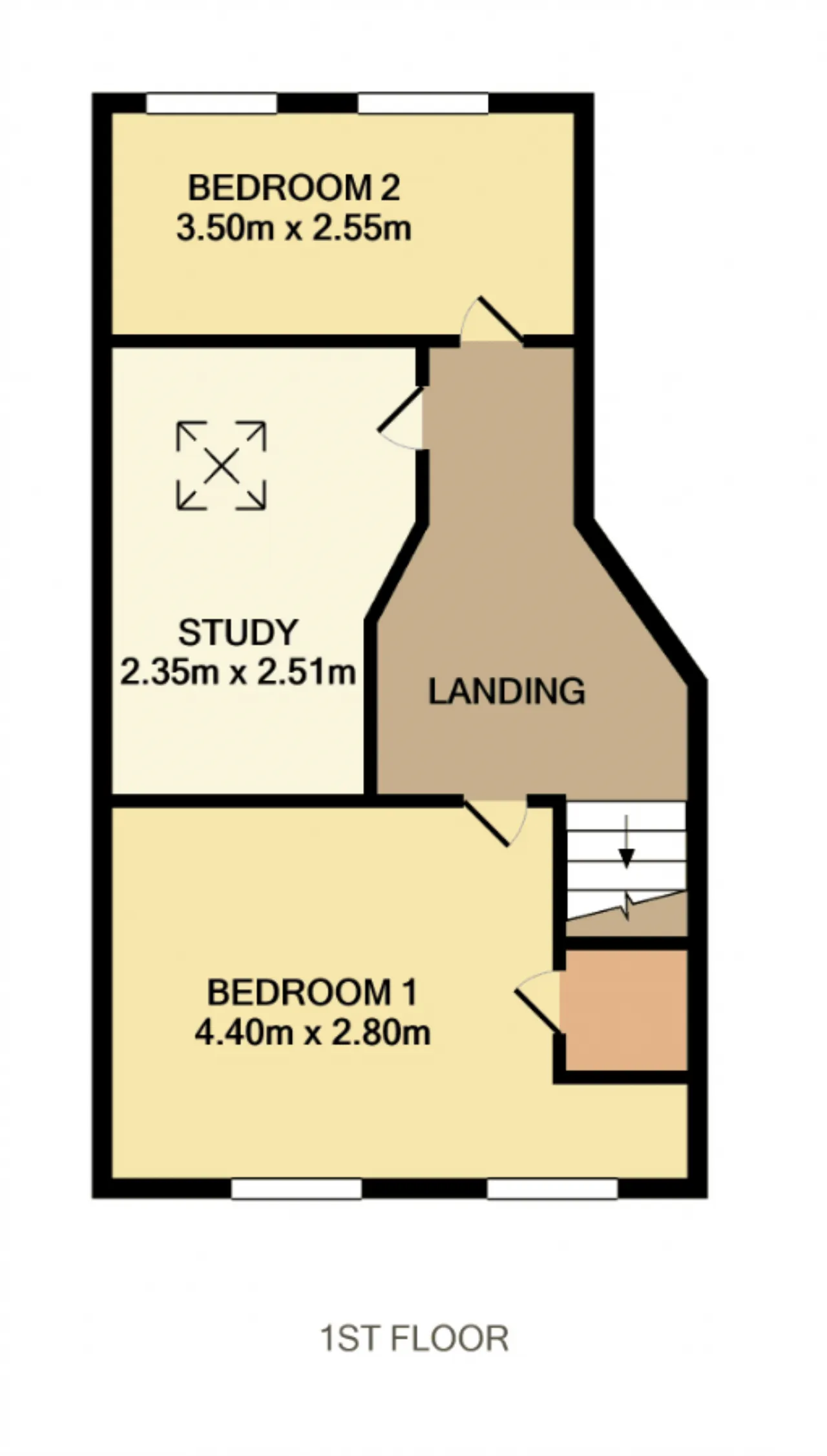 Bedroom 2 3.50m x 2.55m Laminate floor, two windows facing the rear and access to attic.