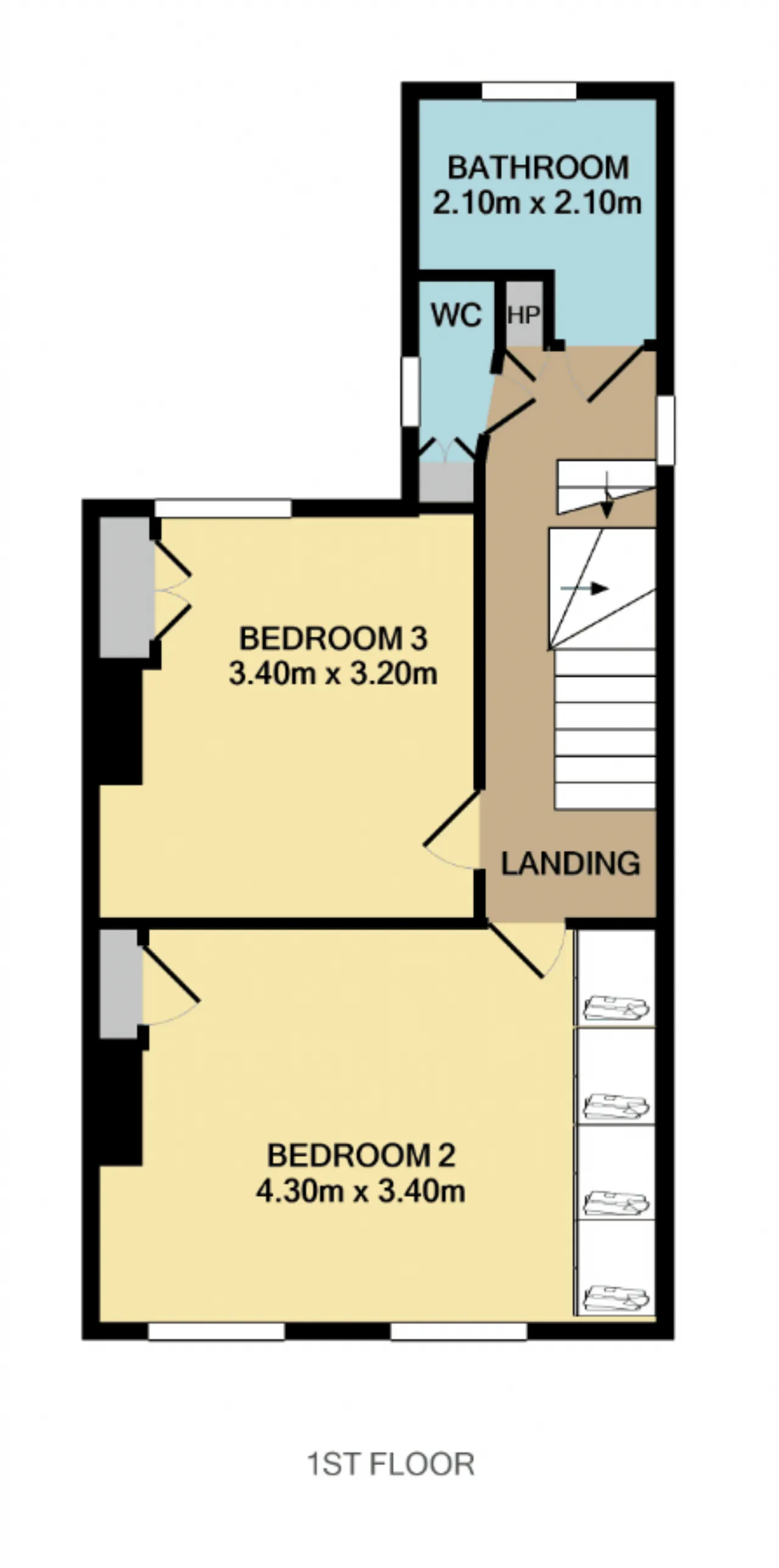 Bedroom 3 3.40m x 3.20m Double bedroom to the rear of the property featuring built in wardrobe and cast iron fireplace