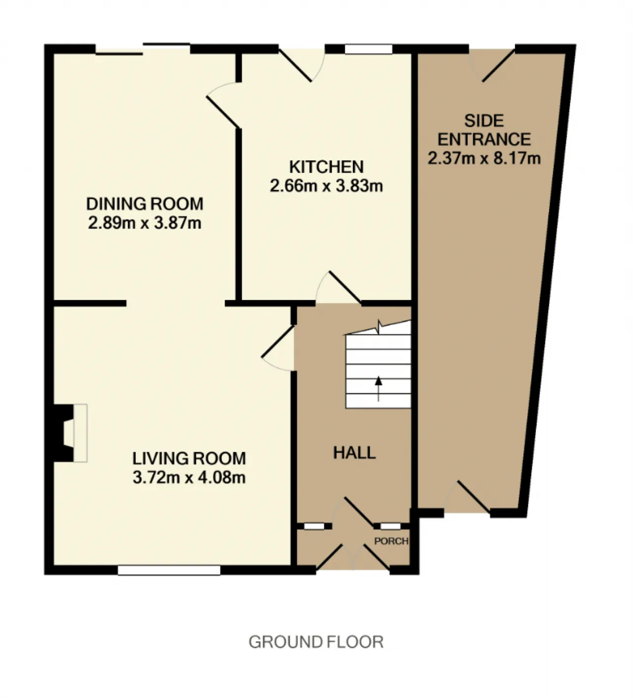 Living Room 3.72m x 4.08m Large front window with solid fuel stove. Opens into: