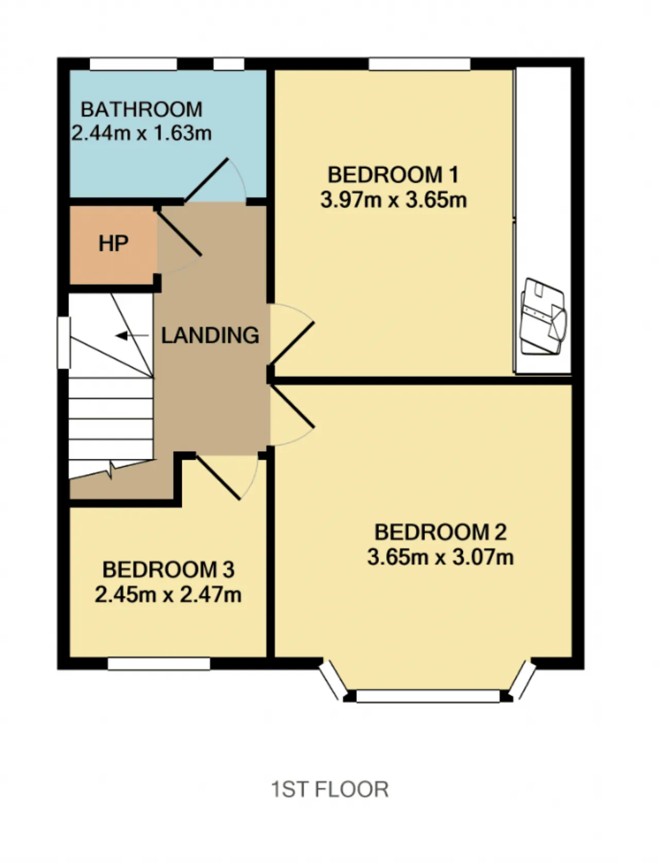 Bedroom 1 3.97m x 3.65m Located to the rear of the property with wooden flooring and built in wardrobes.