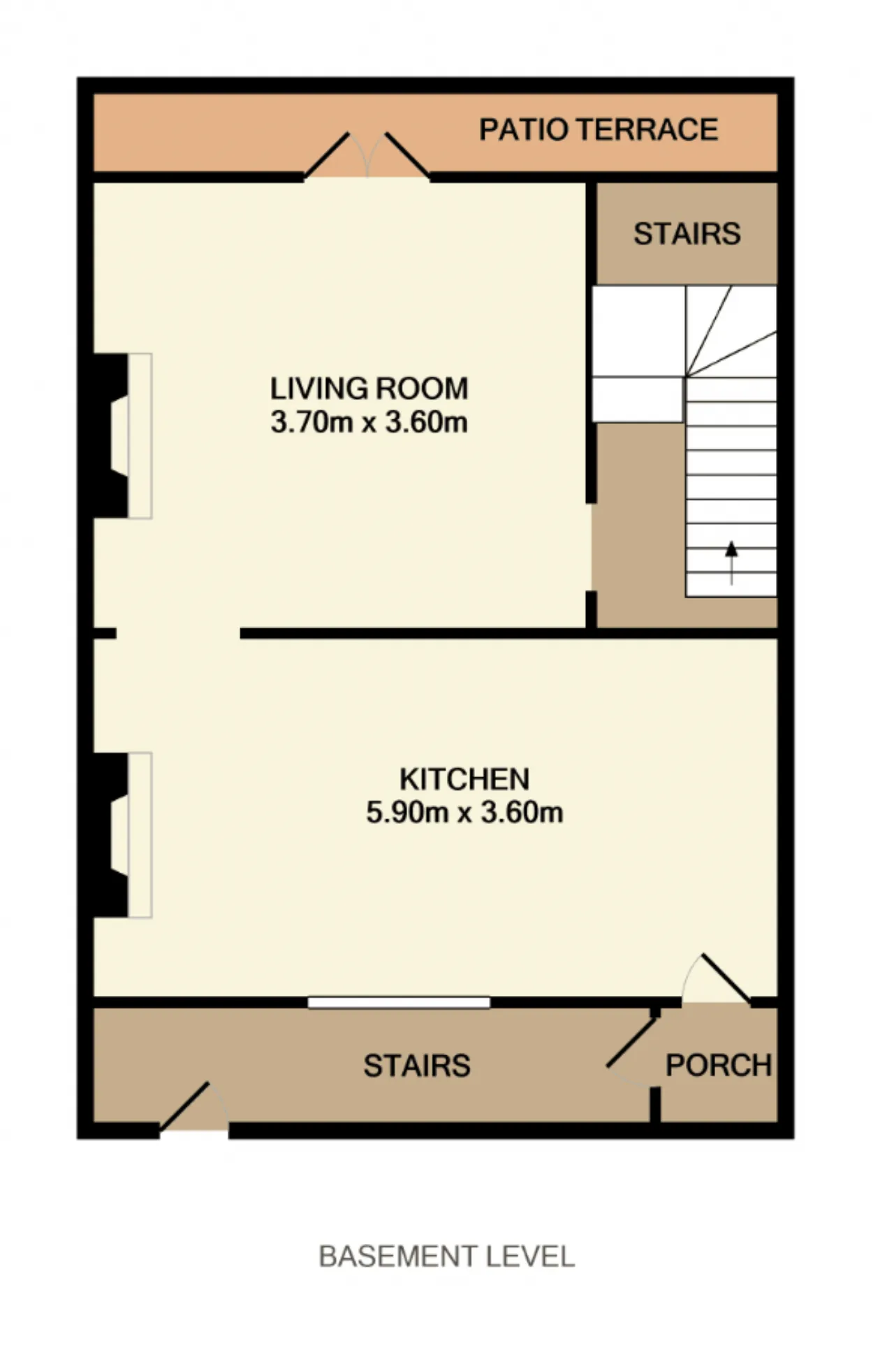 Kitchen/Dining Room 5.90m x 3.60m Fully fitted kitchen with wall and floor units, feature original fireplace opening, door to storage room which gives access to stairway leading from street level.