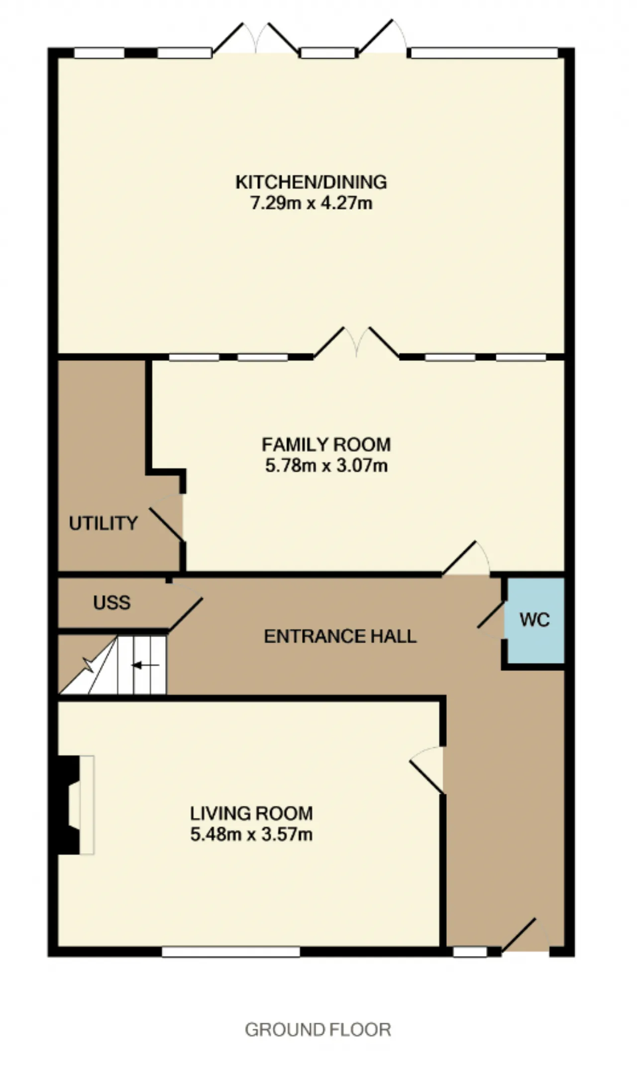 Kitchen / Dining Room: Running the full width of the house, this light filled room has a sky light window and ample windows overlooking the rear. There are patio doors leading out to the garden. The kitchen is fitted with floor and eye level units and breakfast bar with solid wood countertop. There is an integrated dishwasher and a Hotpoint range style over with extractor fan. The splashback is tiled and there is recessed lighting.