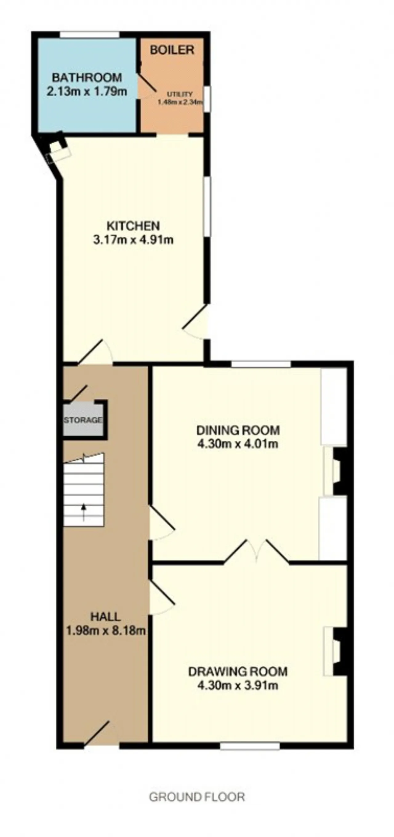 Bedroom 3 3.23m x 4.95m Double room, located on the return. Dual aspect. Feature original fireplace.