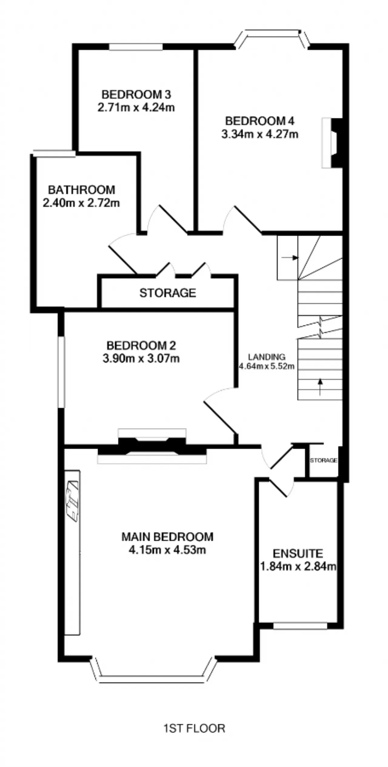 Main Bedroom 4.15m x 4.53m Large bay window, coved ceiling, polished timber floor, bespoke 4 door wardrobe, with generous storage, a pair of fitted bookshelves with two drawers below, original painted cast iron mantelpiece with tiled inset and hearth.