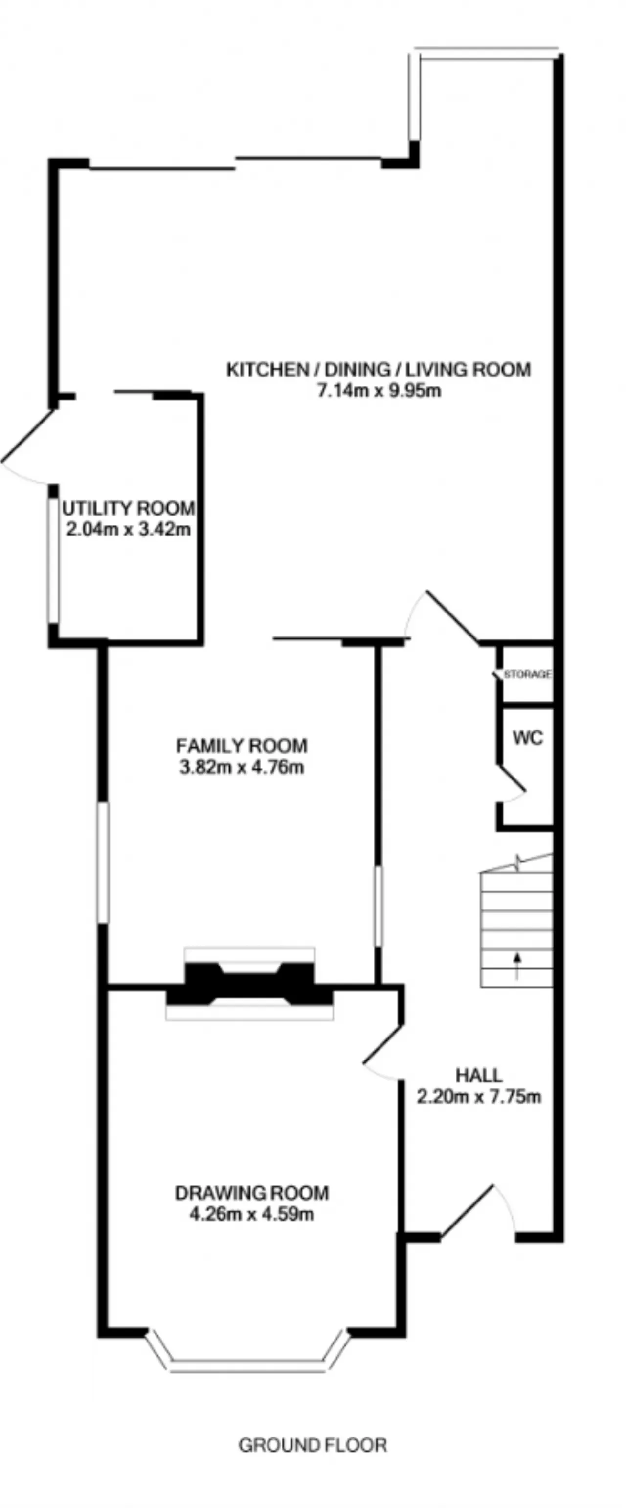 Family Room 3.82m x 4.76m Wide plank oak floor continues, 2 sets of bespoke bookshelves set in alcoves with oak pull out drawers below, opaque glazed fixed window, cast iron wood burning stove, 3 pane picture window, radiator. Glazed Pocket doors from kitchen to: