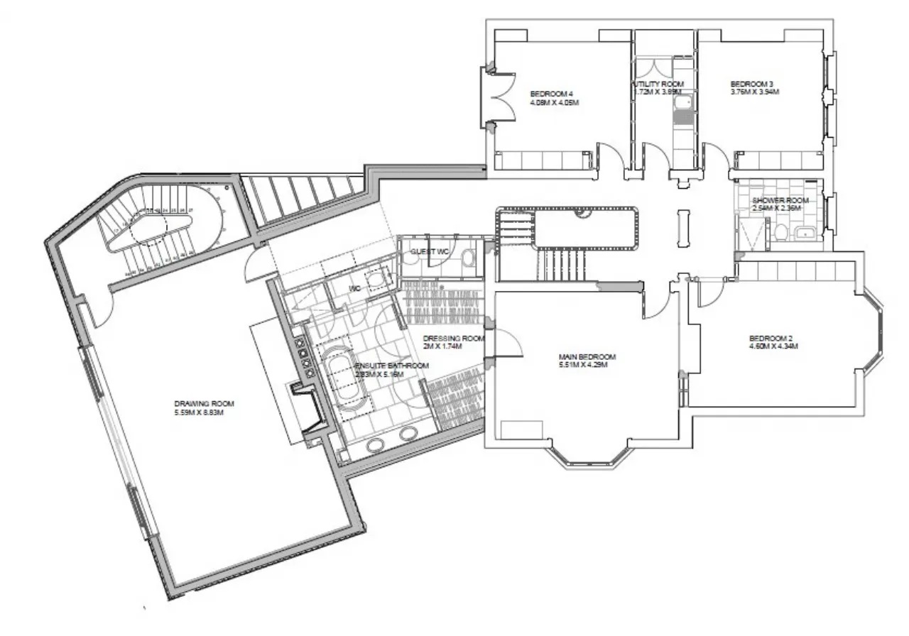 Drawing Room Dramatic full length sliding double doors with glazed screens offering elevated views over the gardens with the benefit of full sun until late evening. Extensive recessed and hidden lighting. A large open fireplace with raised stone hearth. Door to bespoke carved oak second staircase connecting to ground floor and basement.
