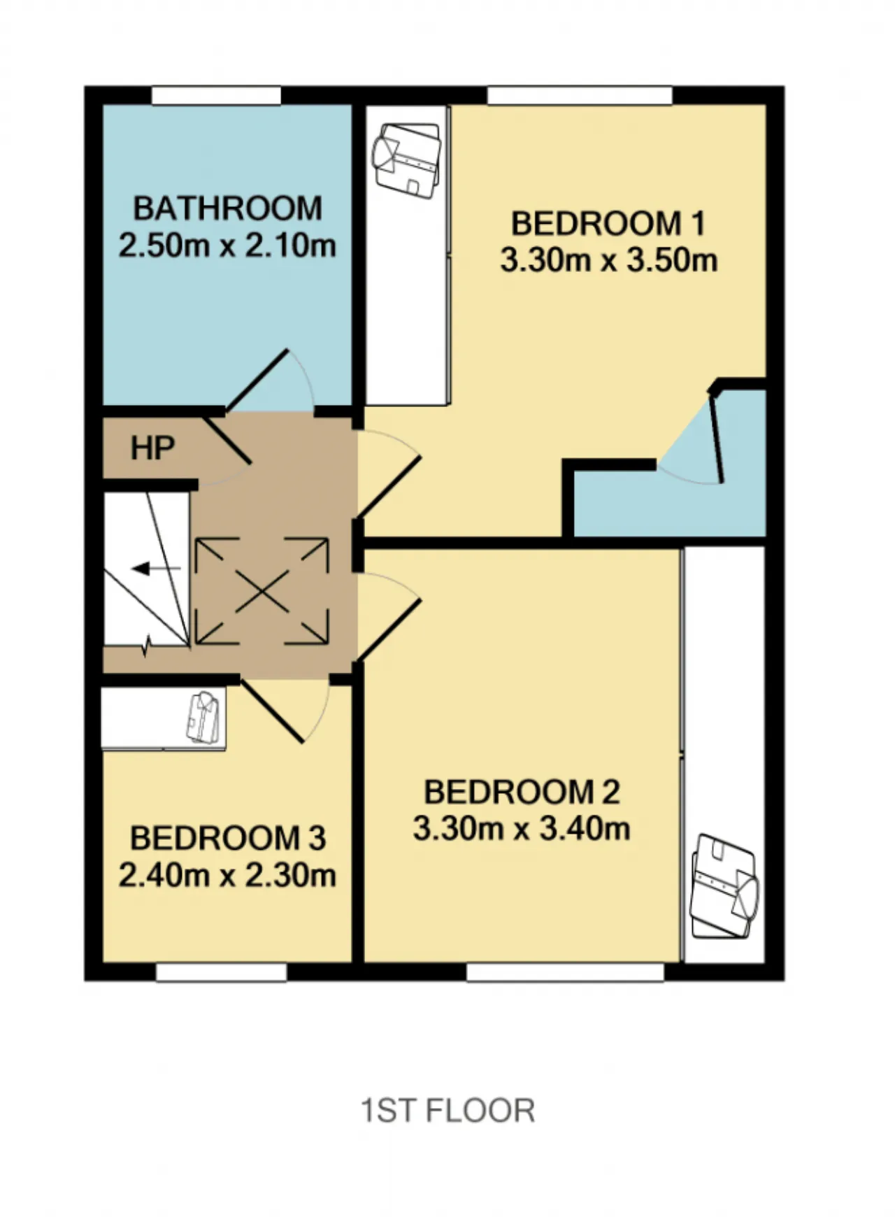 Bedroom 1 3.30m x 3.50m Double bedroom with carpet flooring, window over-looking rear garden and fitted wardrobes.