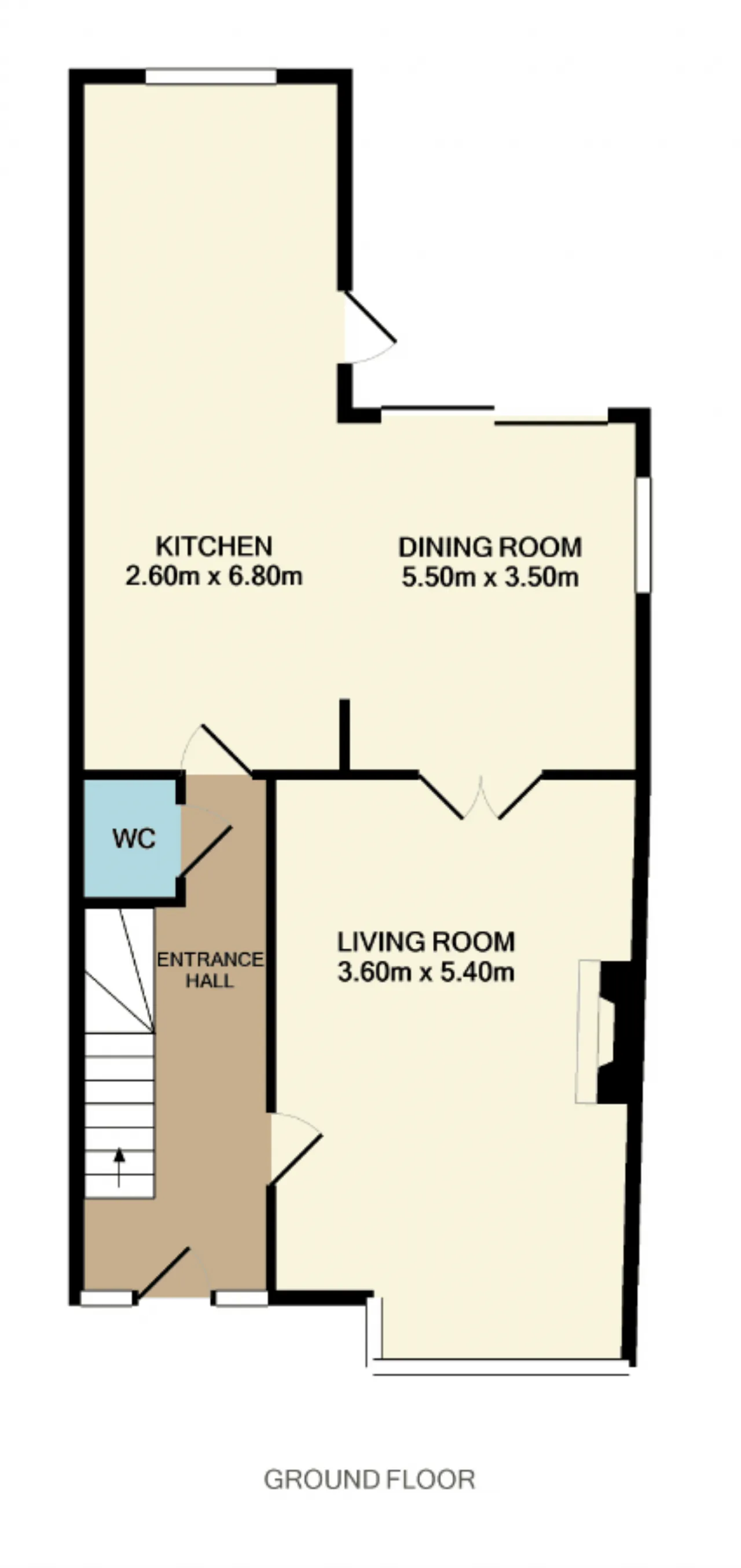 Kitchen Dining Room Kitchen: 2.60m x 6.80m Dining Room: 5.50m x 3.50m Kitchen: Floor and eye level units, tiled splashback, stainless steel sink and drainer, recessed lighting, integrated gas hob, fridge freezer, oven, dishwasher, extraction unit and door accessing rear garden. Dining Area: Hardwood flooring. sliding doors accessing rear garden and window to side.