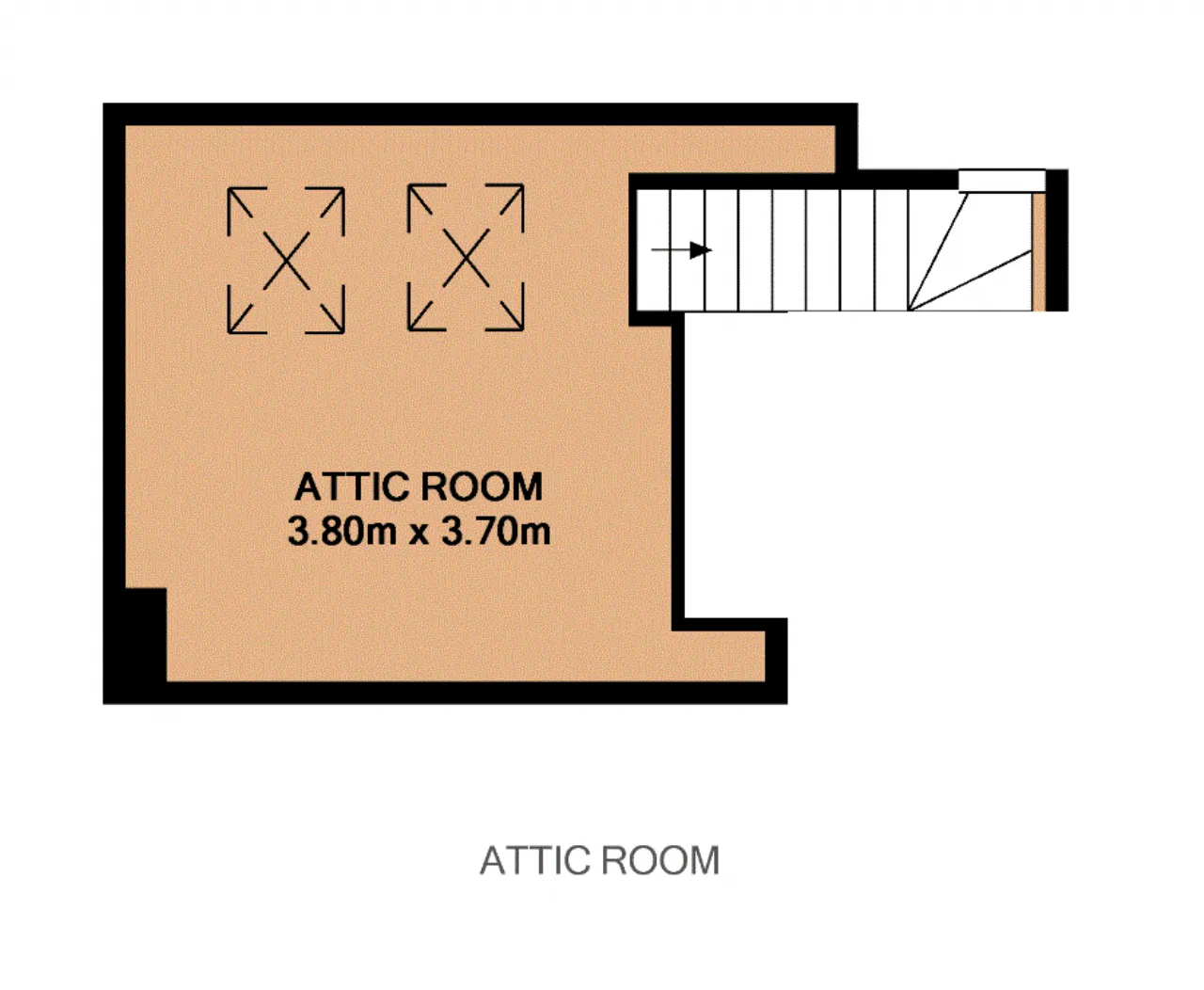 Attic Room 3.80m x 3.70m generous room with recessed lights, generous eaves storage and two Velux roof lights.