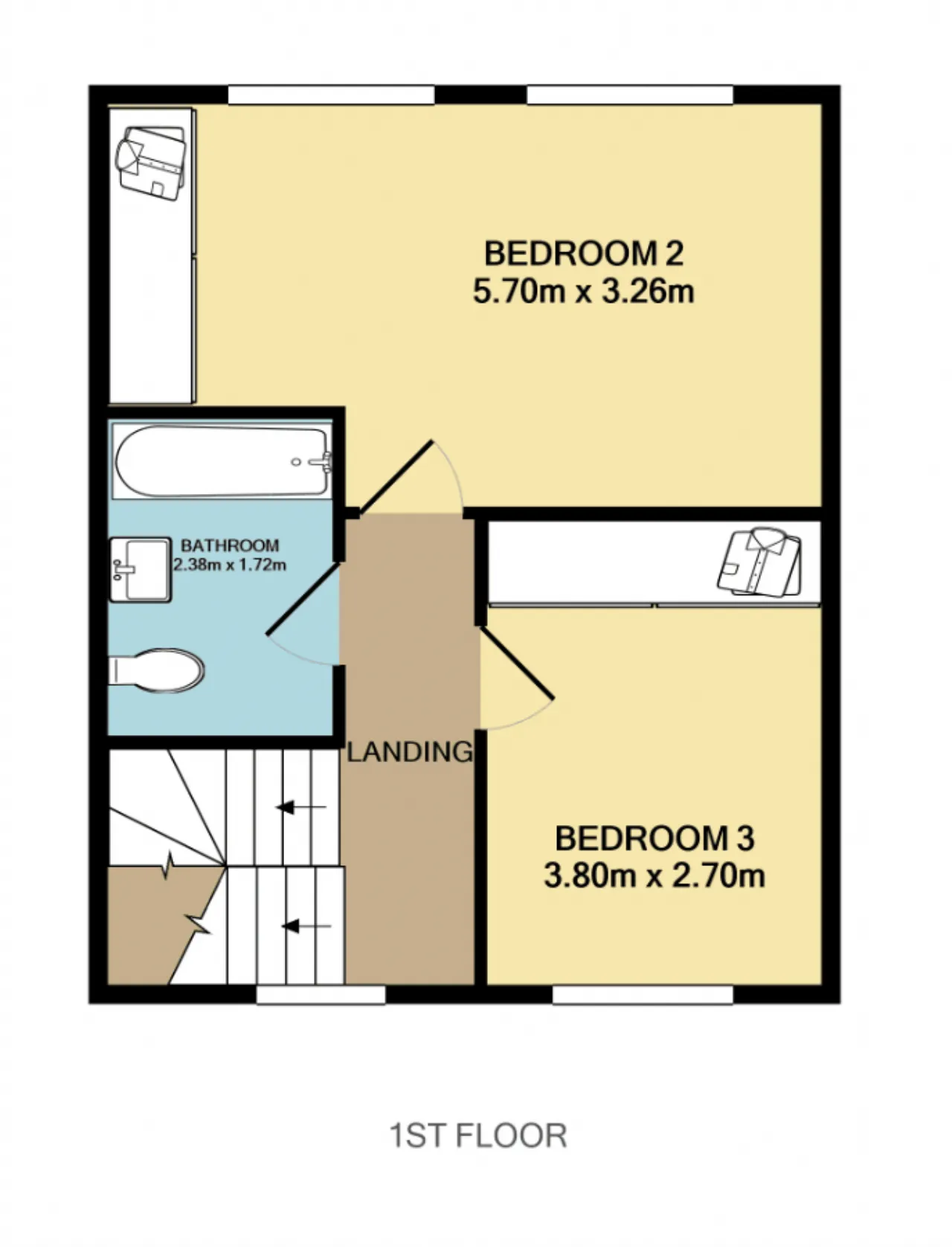 Bedroom 2 5.7m x 3.26m Second double bedroom, located to rear of the house, with timber flooring and double fitted wall to wall wardrobes.