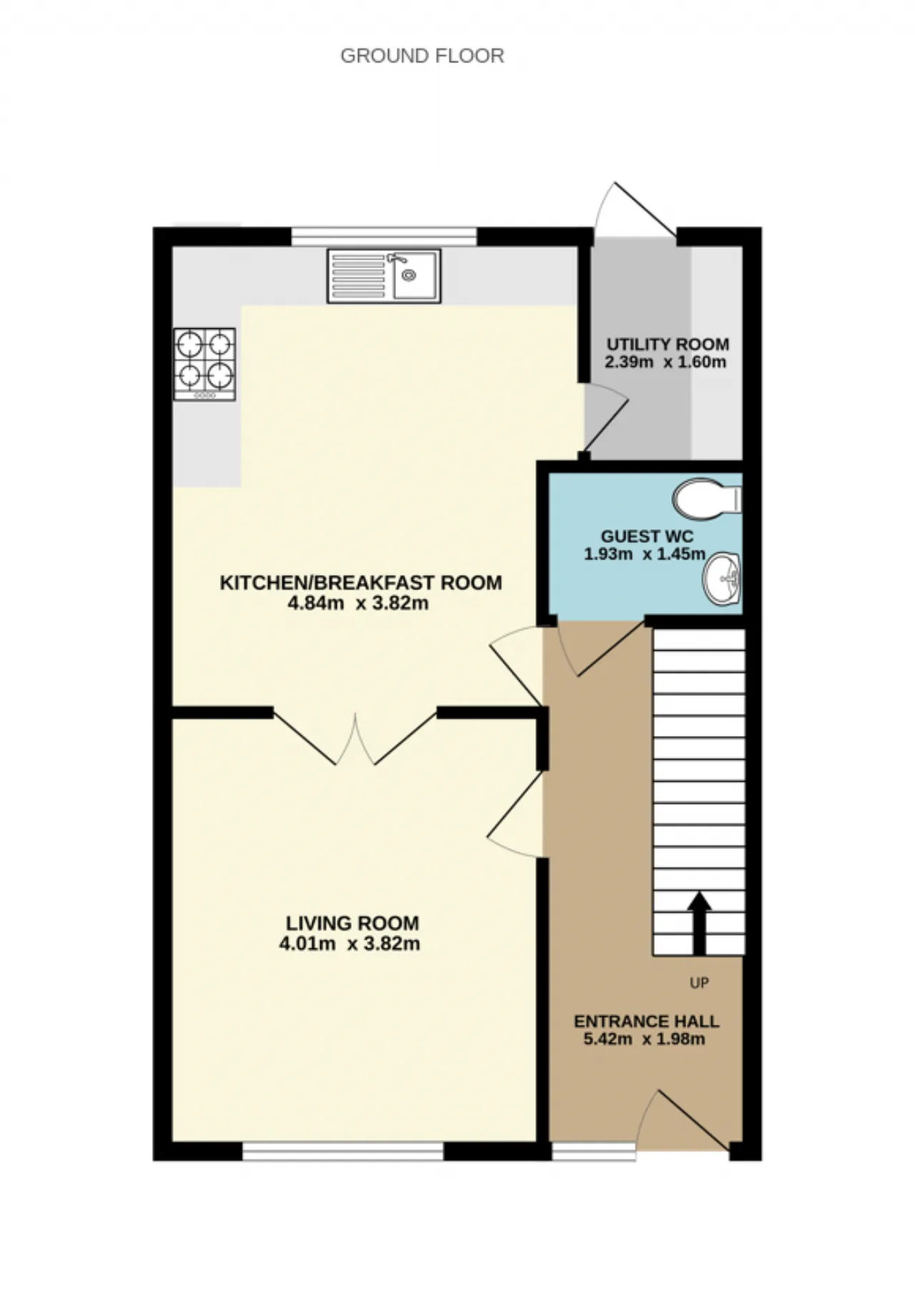 Guest WC A great size, situated just off the hallway, with stylish, tiled flooring. Comprises of a wc and wash hand basin.