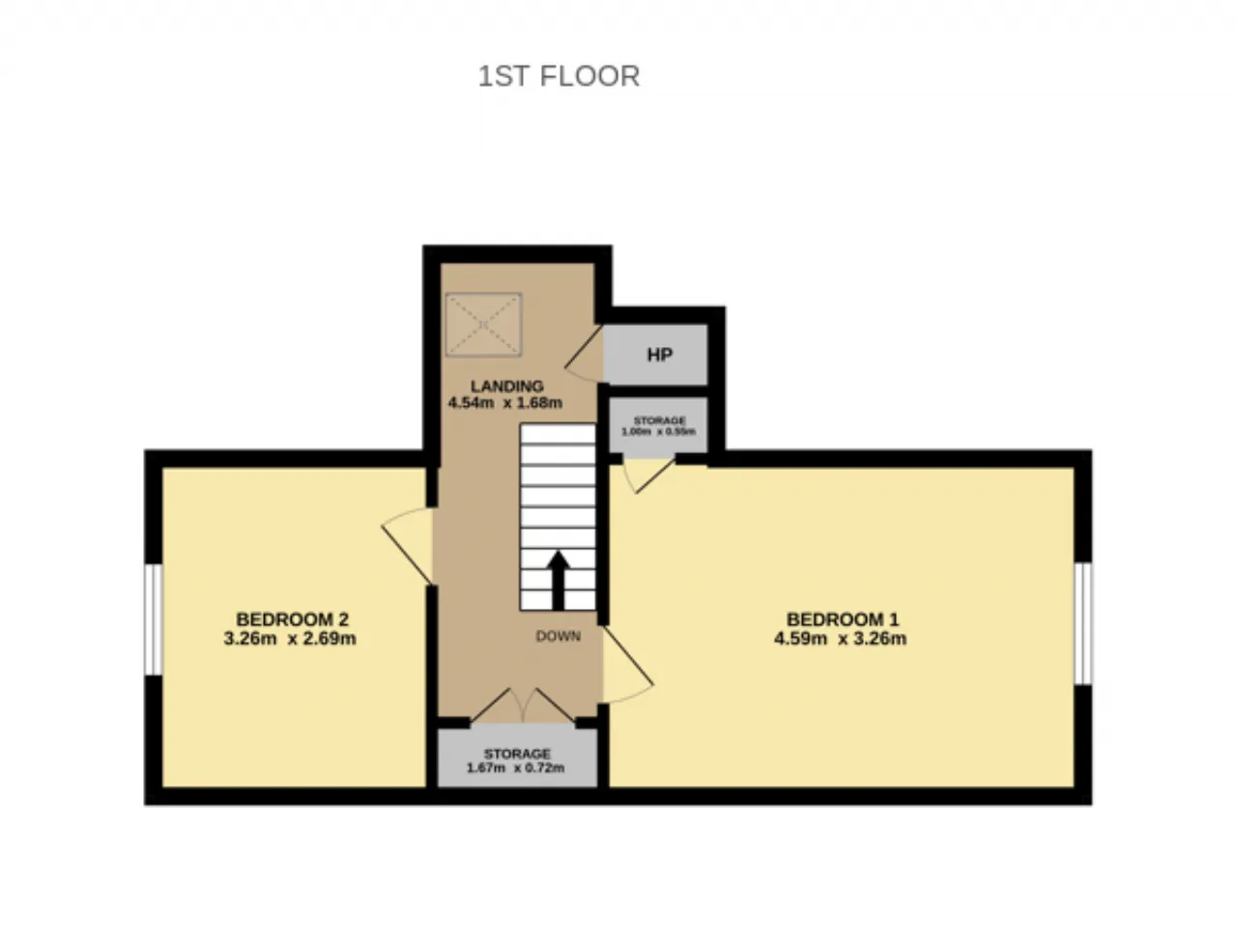 Landing 4.54m x 1.68m Carpet flooring continues from the stairs. Holds the hotpress, as well as an additional storage press. Provides access to the attic storage.