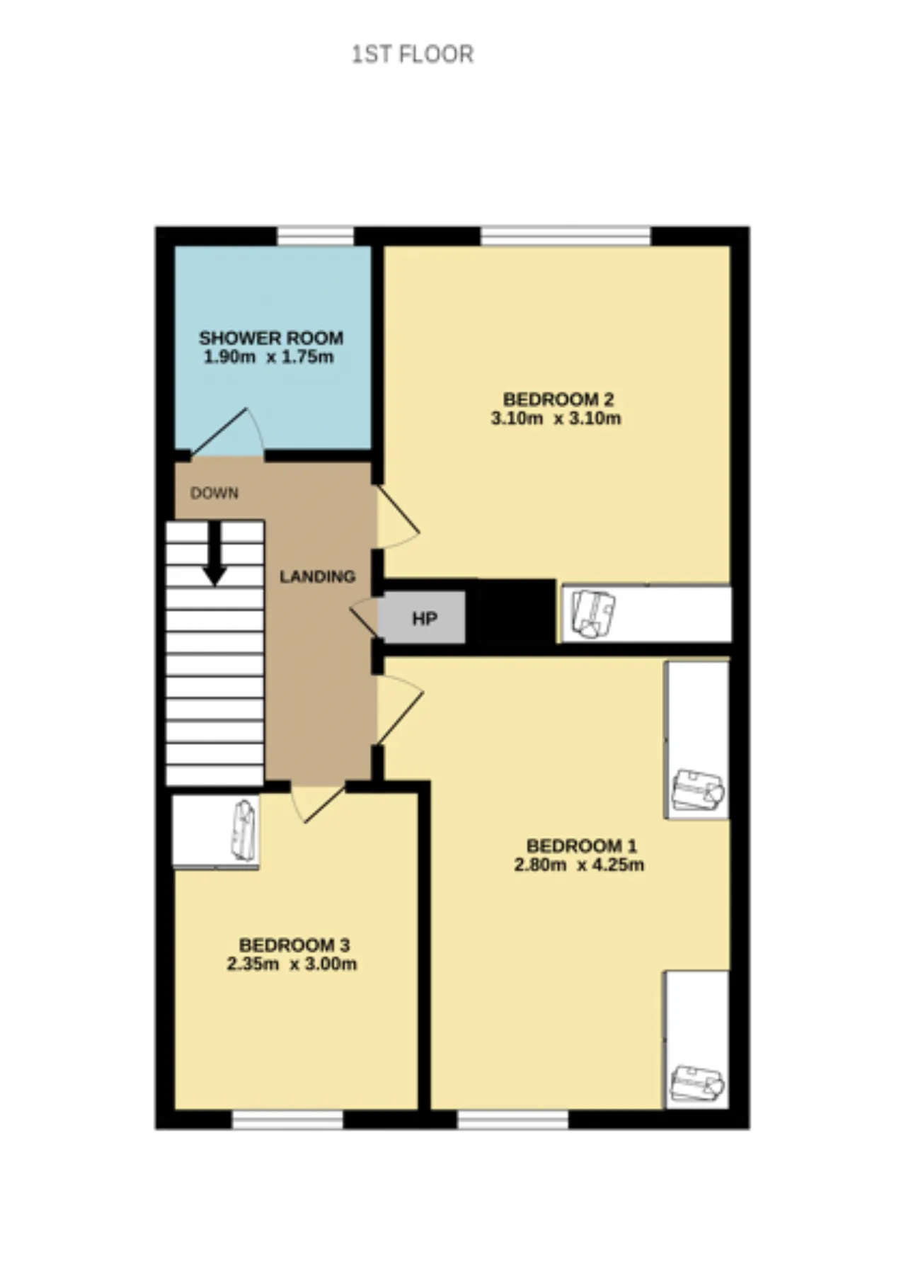Bedroom 1 4.25m x 2.8m Generous double bedroom to the front featuring a large front-facing window, built-in wardrobes, and carpet flooring.