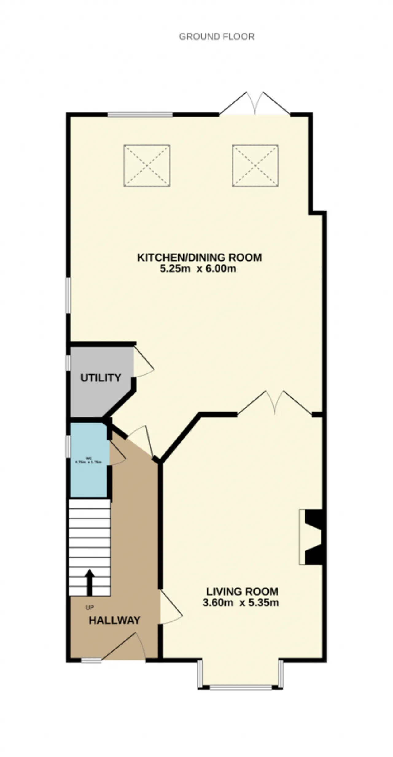 Guest W.C. 0.75m x 1.75m Crean tiled floor, w.c., wash hand basin, recessed lights and window to side