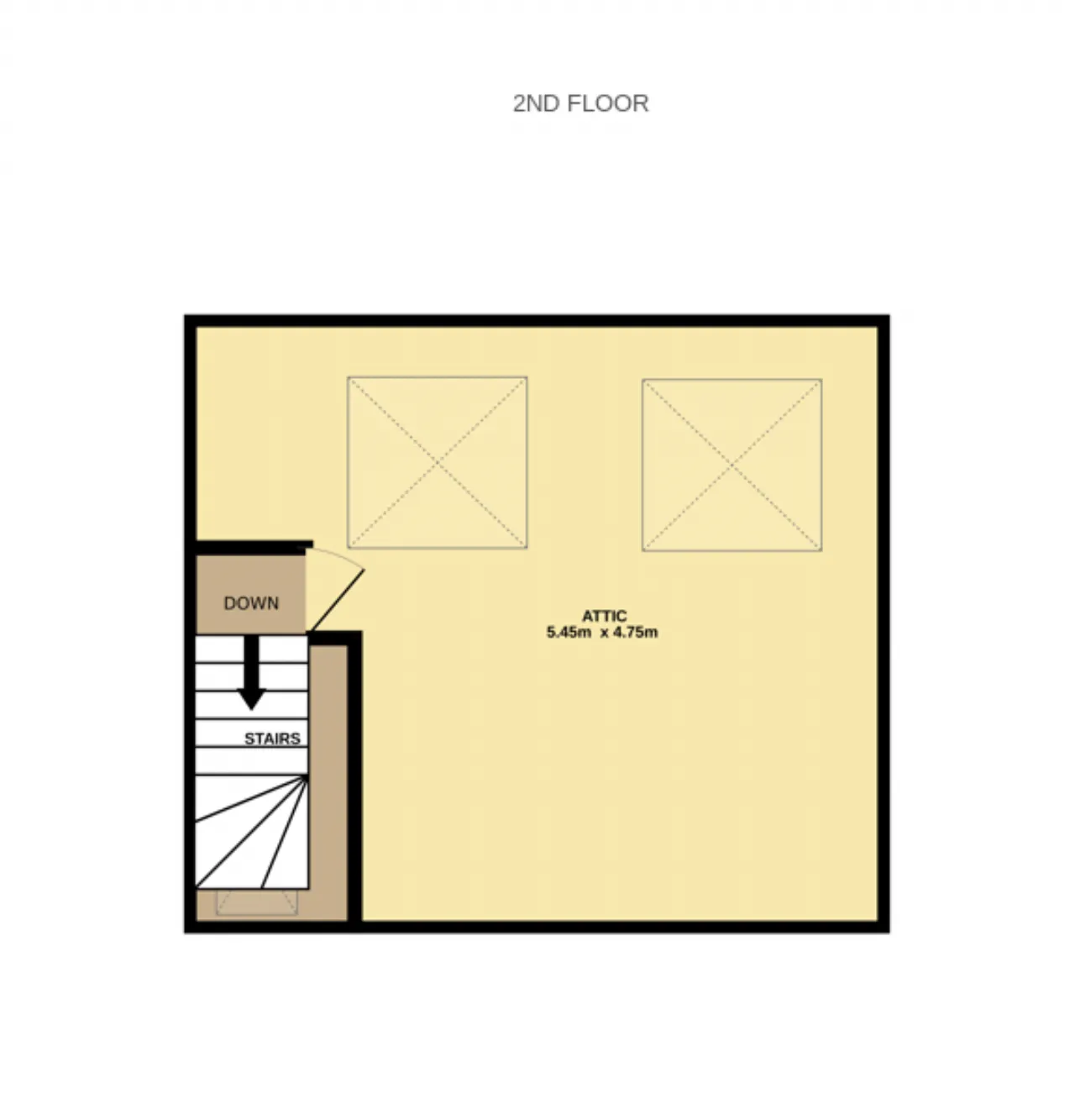 Attic 5.45m x 4.75m Stairs to very spacious attic with two large velux windows, eaves storage, brick effect tiles on one wall, engineered wood flooring, recessed lights