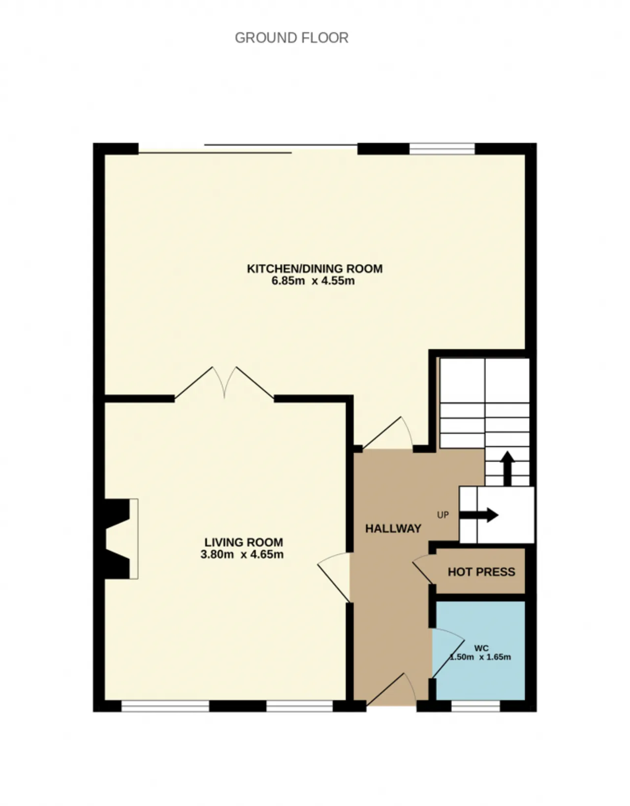 Guest WC 1.50m x 1.65m WHB, wc, tiled floor.