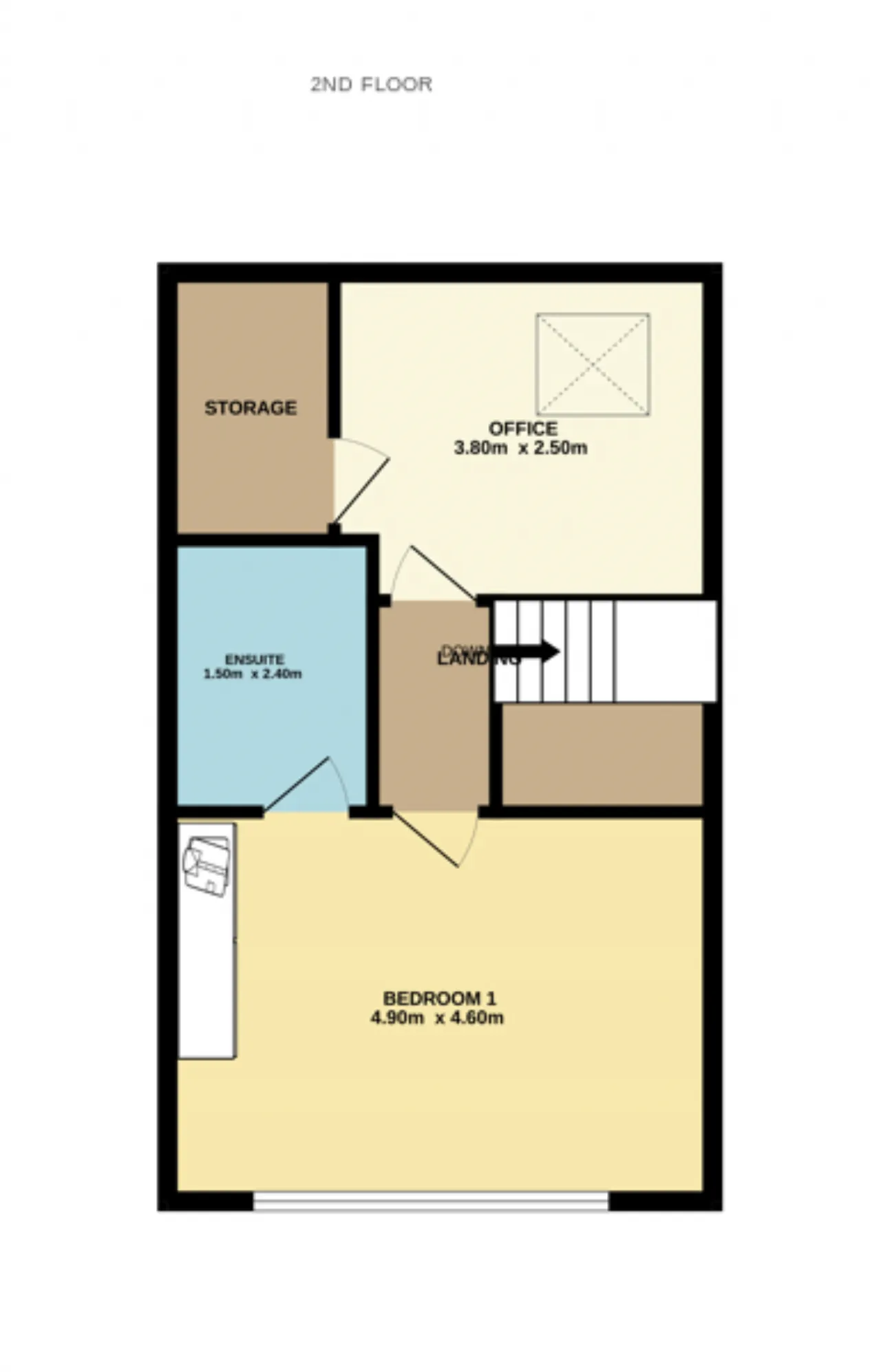 Second floor: Large main bedroom with ensuite and study / store room (with hotpress).