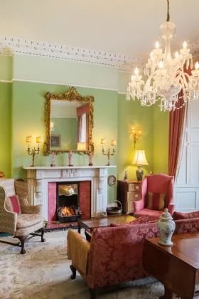 Drawing Room: beautifully proportioned room with bay window, ceiling cornice, centre rose, picture rail and stunning marble fireplace with open fire.