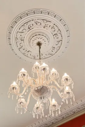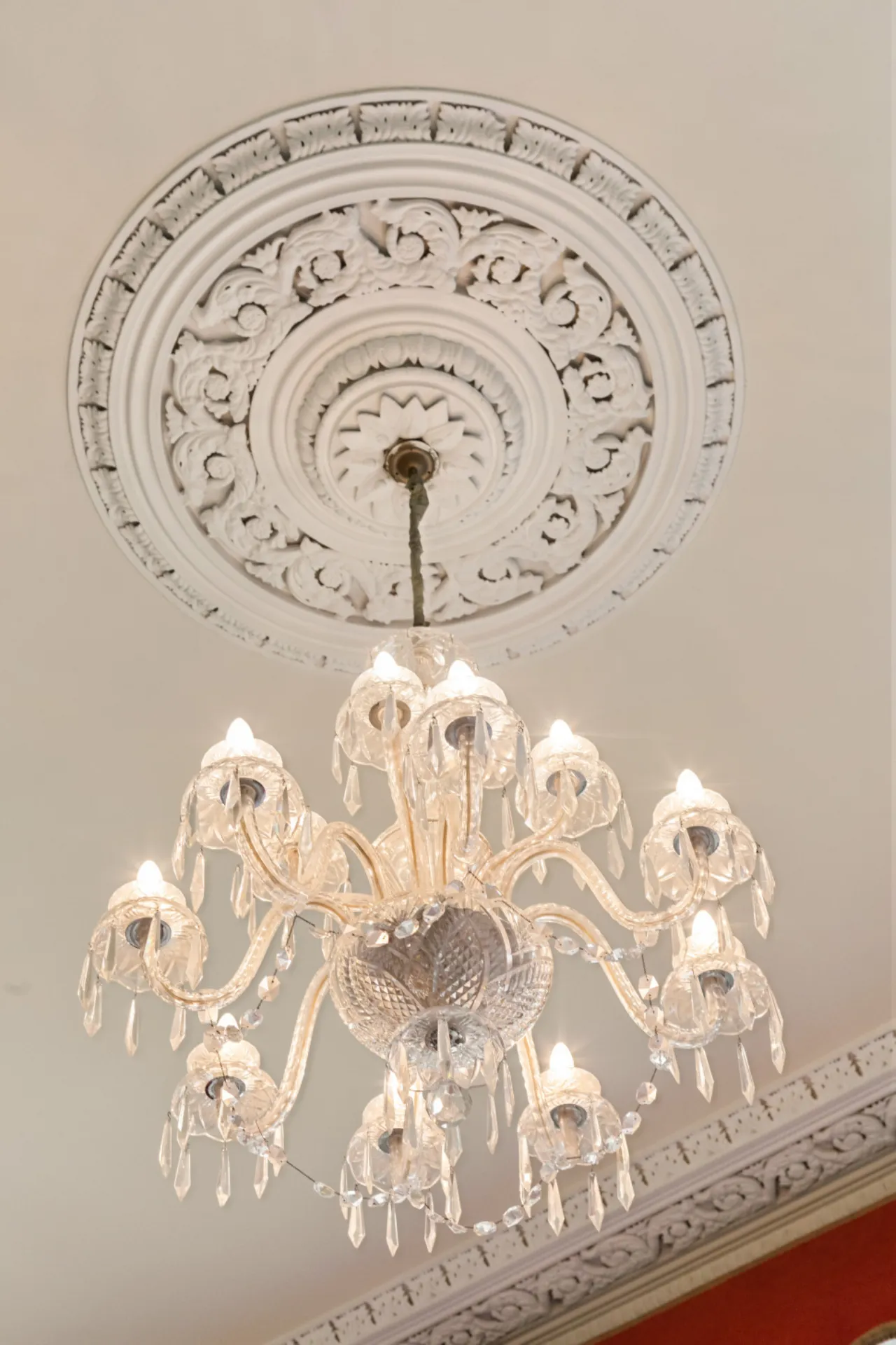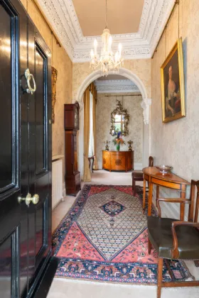 Entrance Hall: beautifully appointed hall with stunning ornate ceiling cornice and centre roses and stained glass window to the side.