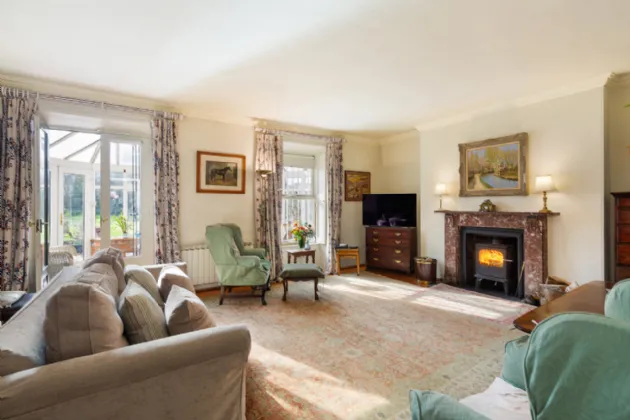 Living Room: with timber floor, ceiling cornice, marble fireplace, cast iron stove and French doors to: