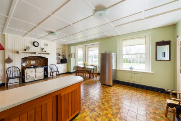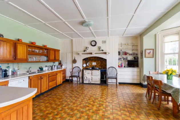 Kitchen / Breakfast Room: with a range of timber wall and floor units, cream AGA, plumbing for dishwasher, tiled floor, panelled ceiling, and bay window overlooking the front garden.