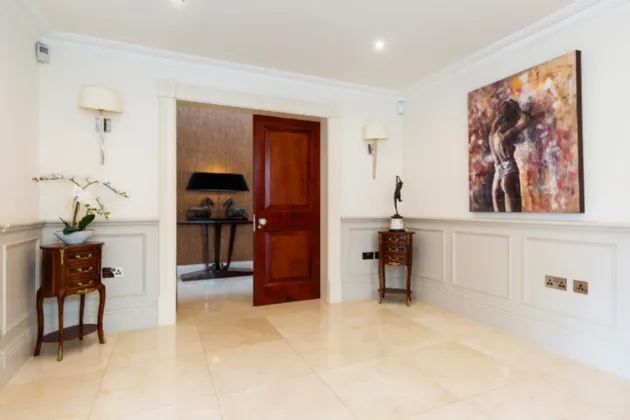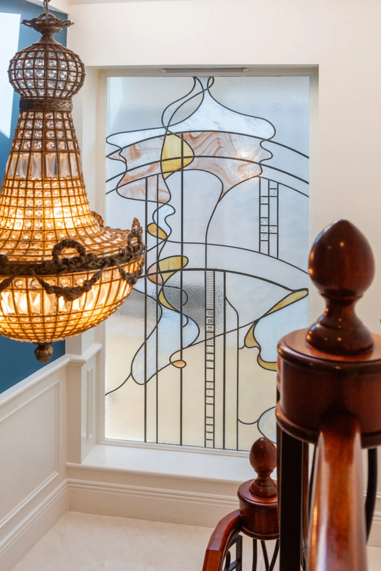 . The impressive, curved marble staircase leads to the ½ landing with bespoke stained-glass window, and to the spacious landing with Crema Marfil tiled floor.