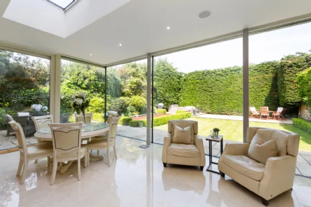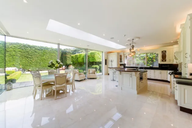 Kitchen / Breakfast Room: with marble tiled floor, floor to ceiling glazed walls and sliding patio door to the rear. The kitchen area is fitted with an extensive range of Christoff wall and floor units incorporating Miele dishwasher, double Belfast sink with boiling water tap, full height fridge, larder unit, glazed display cabinets, pelmet lighting, and granite worktops. The large L-shaped island incorporates an excellent range of fitted presses and a circular stainless-steel sink with boiling water tap, microwave and raised timber breakfast counter.