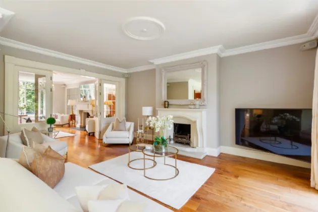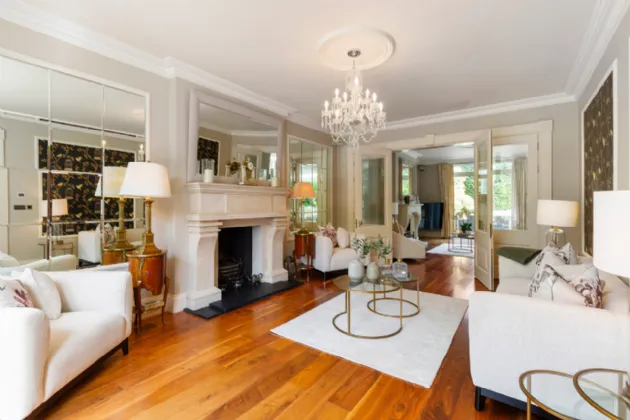 Drawing Room: with feature oak flooring, magnificent limestone fireplace with coal effect gas fire, mirrored alcoves and glazed cantilever folding doors to;