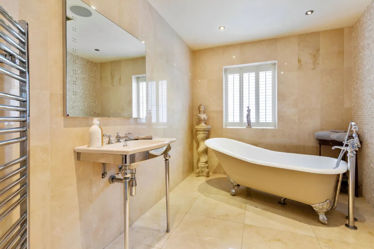 Luxurious Bathroom: with tiled floor and walls, feature mosaic tiled wall, standalone role top bath with WHB, WC, heated rowel rail and mirrored medicine cabinet.