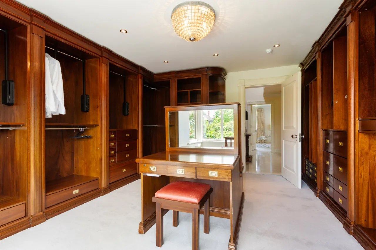Walk-in Dressing Room / Bedroom 4: with an extensive range of mahogany, fitted drawers with matching brass handles, full length and ½ length hanging presses, central dressing table and seating area and large bay window.