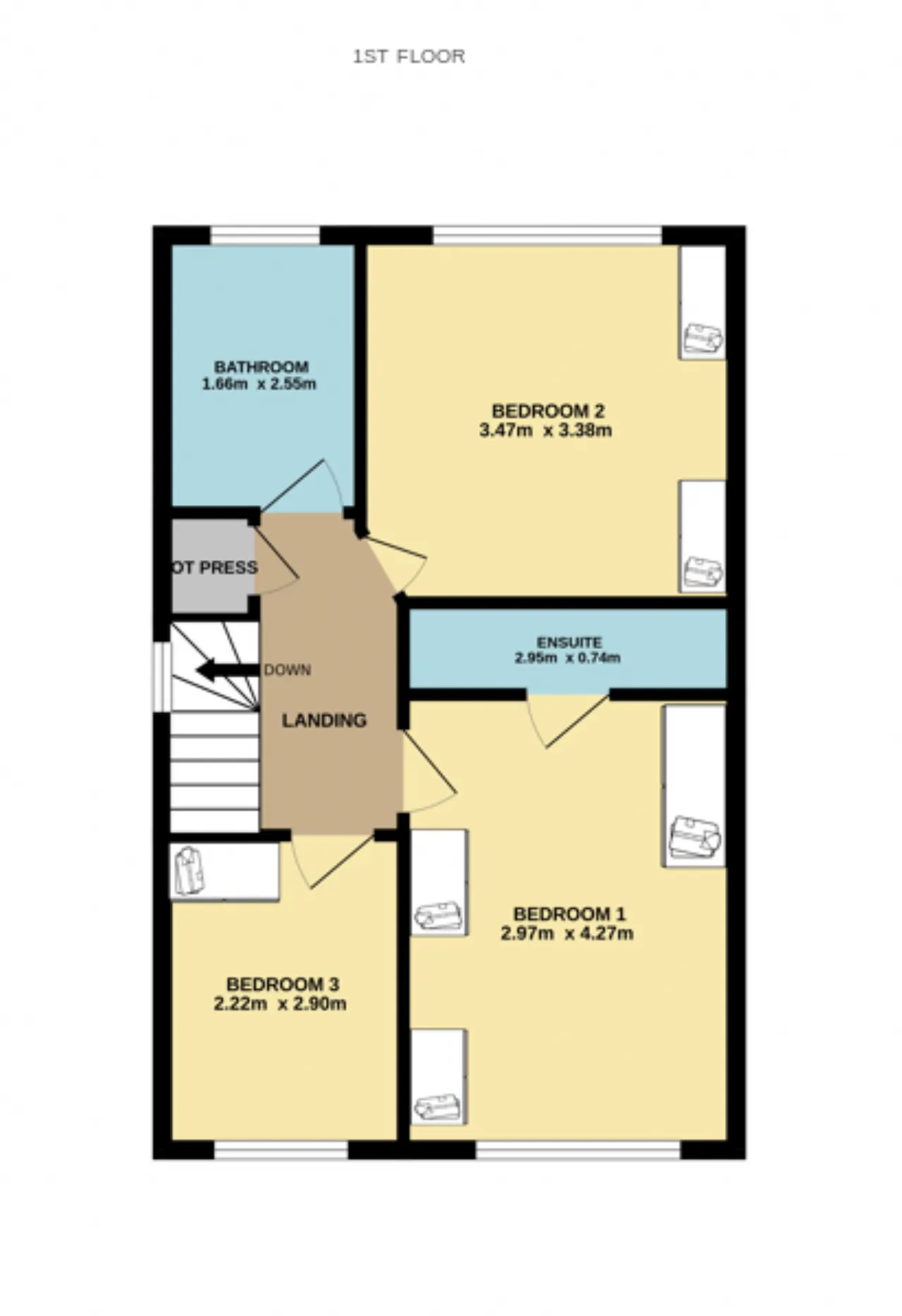 Bedroom 1 2.97m x 4.27m This bright and comfortable bedroom features a fitted wardrobe for convenient storage, soft carpet flooring, a front-facing window that fills the space with natural light, and a stylish radiator cover for a neat, finished look.