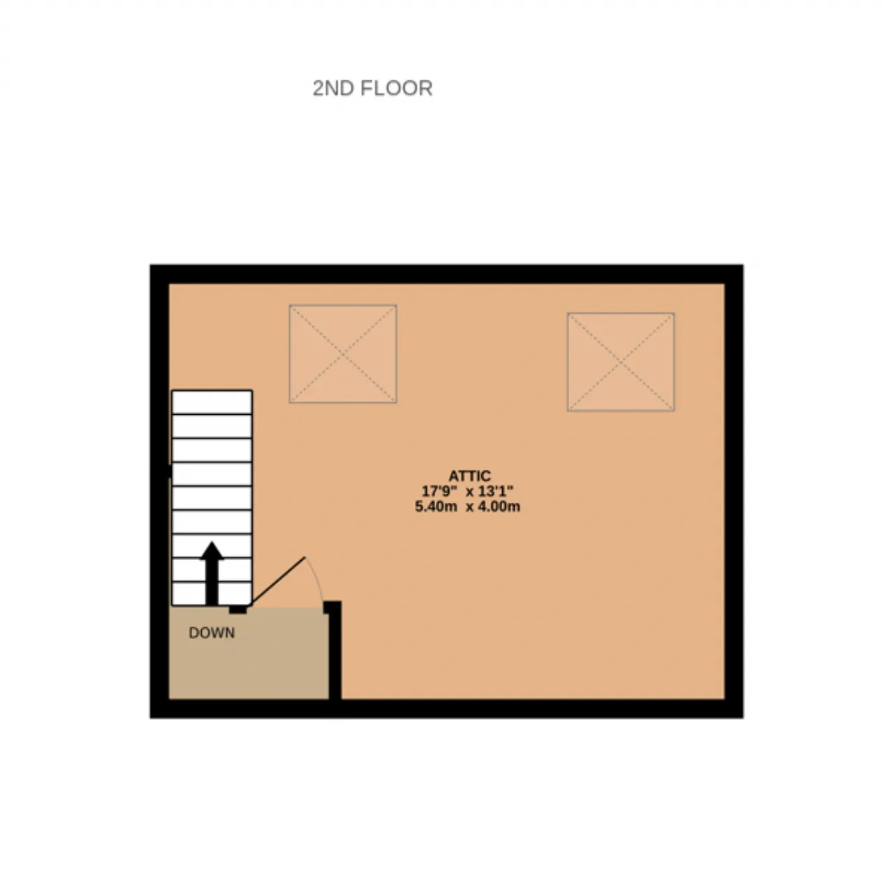 Attic 5.4m x 4.0m A versatile attic space featuring carpet flooring and two skylights that flood the room with natural light, ideal as a workspace.