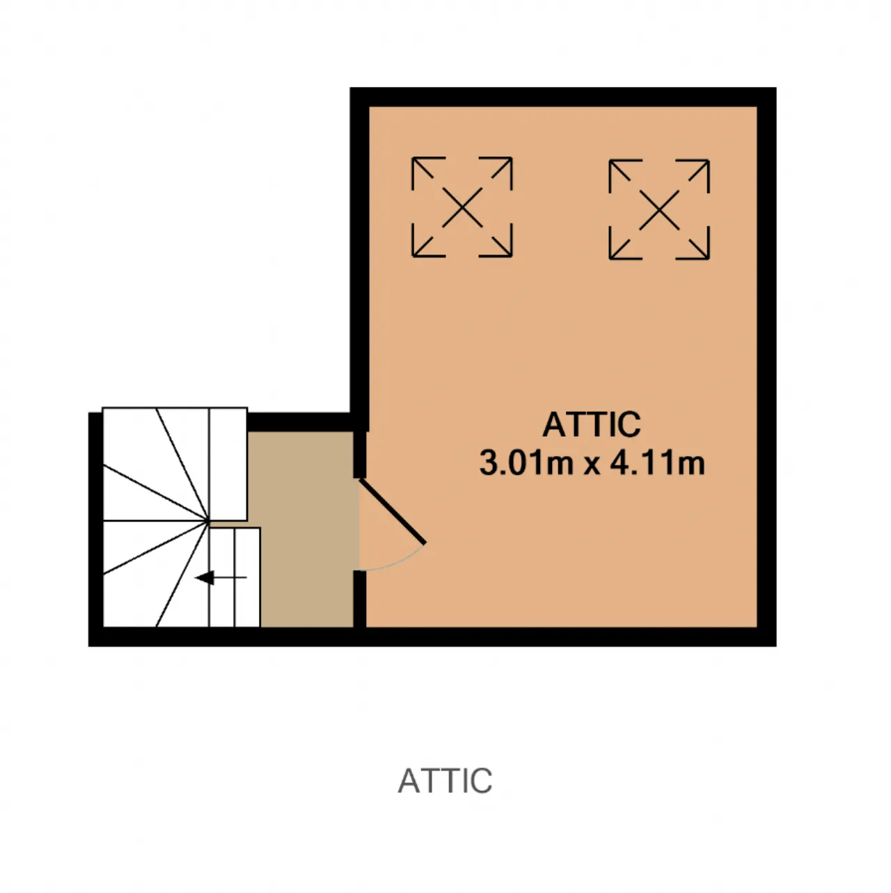 Attic Room 3.01m x 4.1m Full-height carpeted, light-filled space with areas designed for sleeping, two highly-insulated Velux windows, access to considerable under eaves storage. Currently in use as an office with plenty of power points, easy internet access.