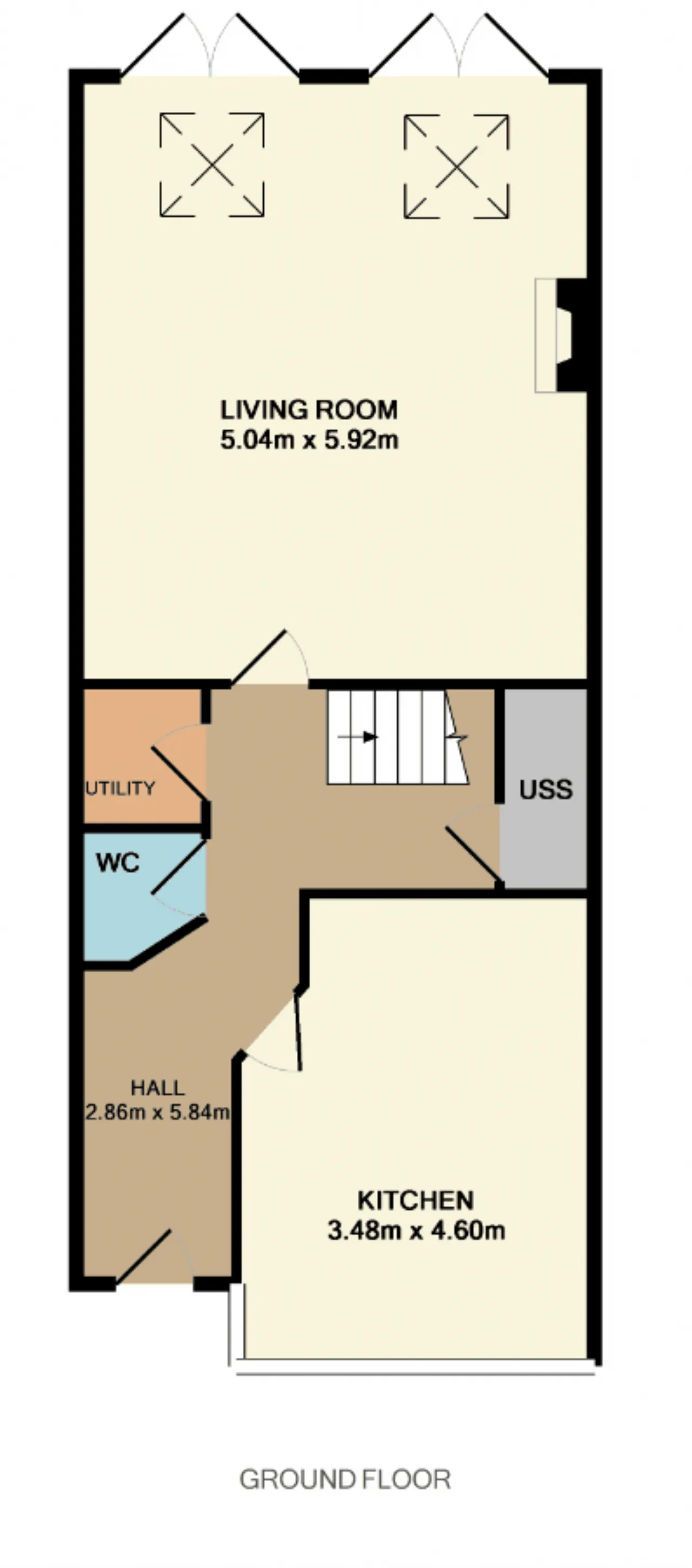 Living Room 5.04m x 5.92m Wooden flooring, fireplace with wooden mantle and coal effect inset, TV point, two sets of glazed double leading out to rear garden, Velux windows.