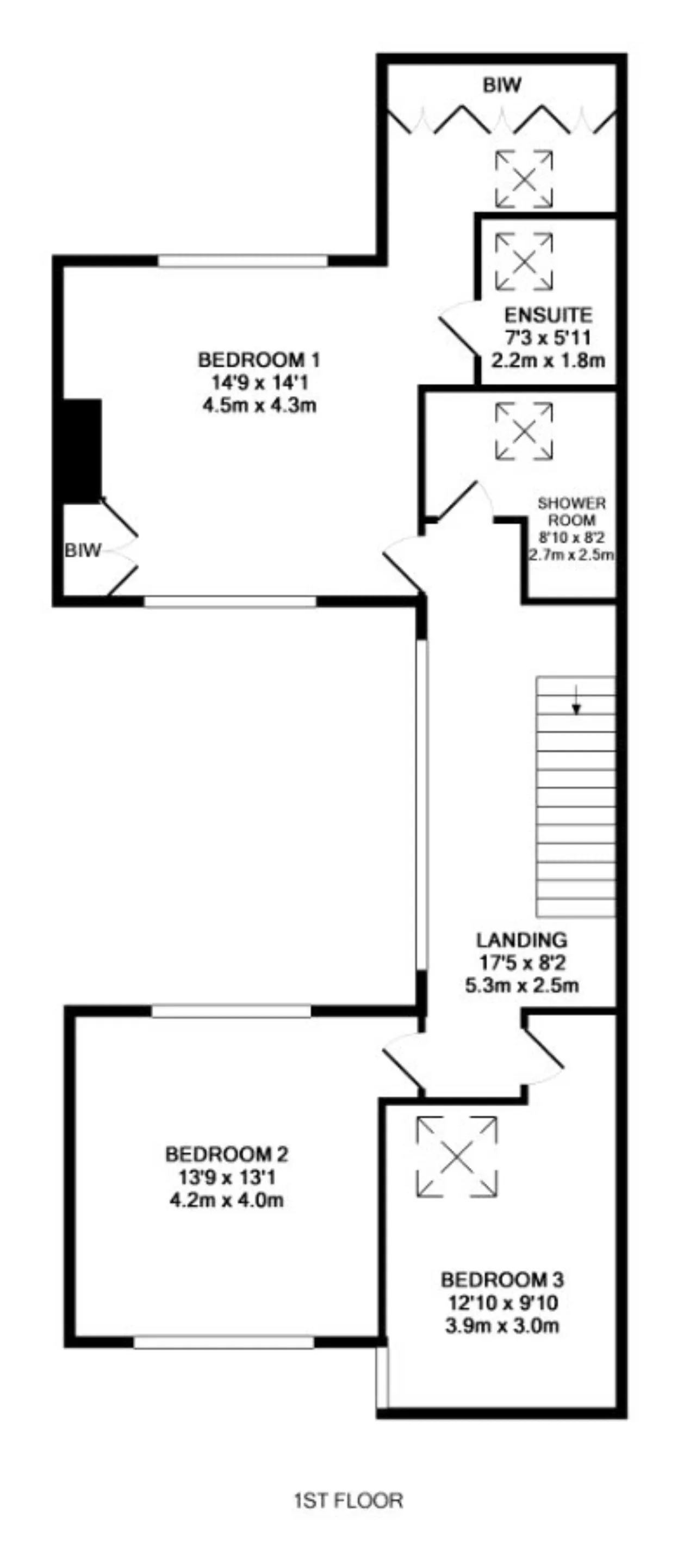 Bedroom 1 4.5m x 4.3m Spacious double bedroom with wood floor, pitched ceiling, recessed lighting, extensive built in wardrobes and separate dressing area.