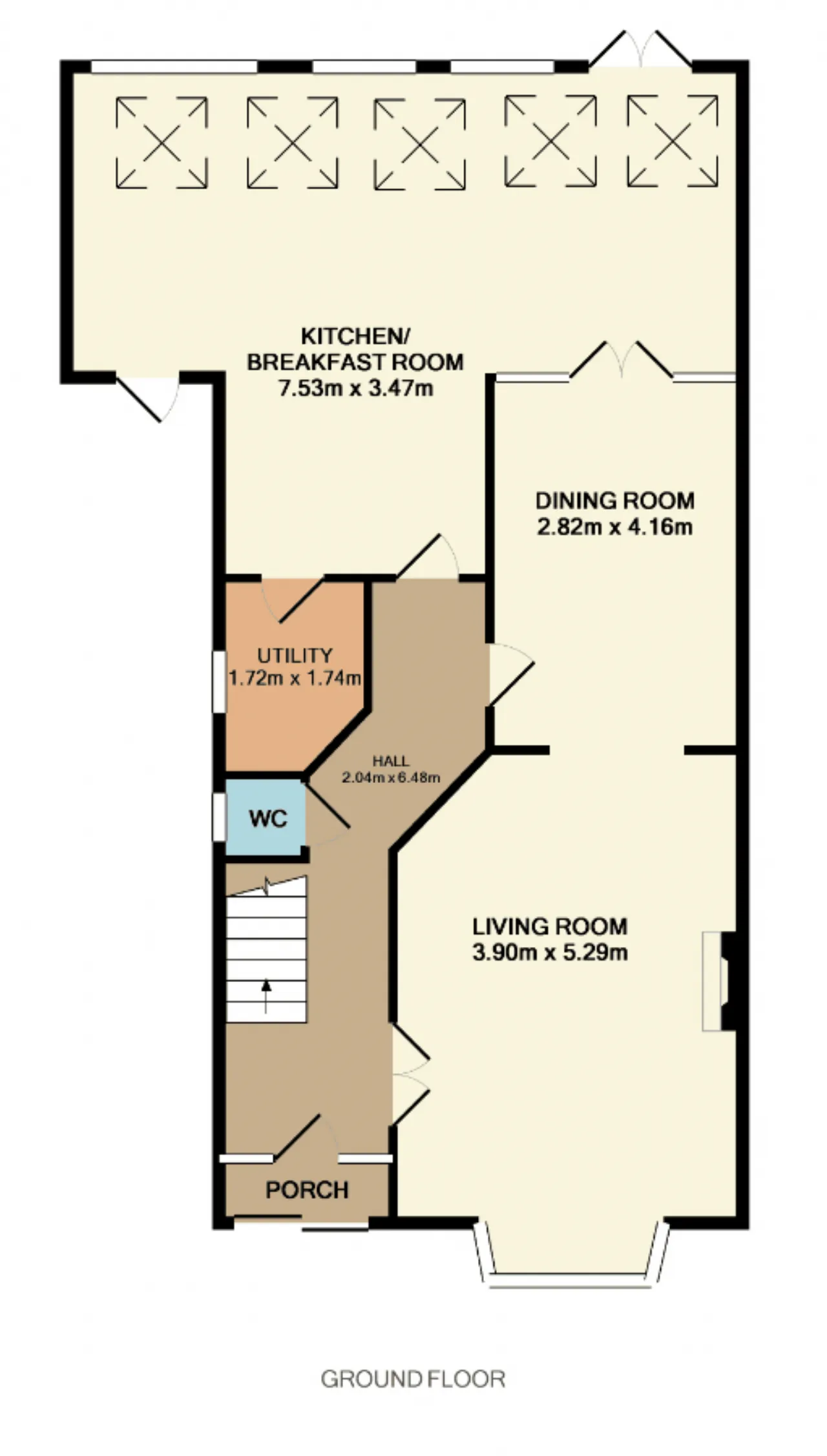 Hall 2.04m x 6.48m Bright entrance hall with access to under stairs storage. Tiled floor and radiator cover.